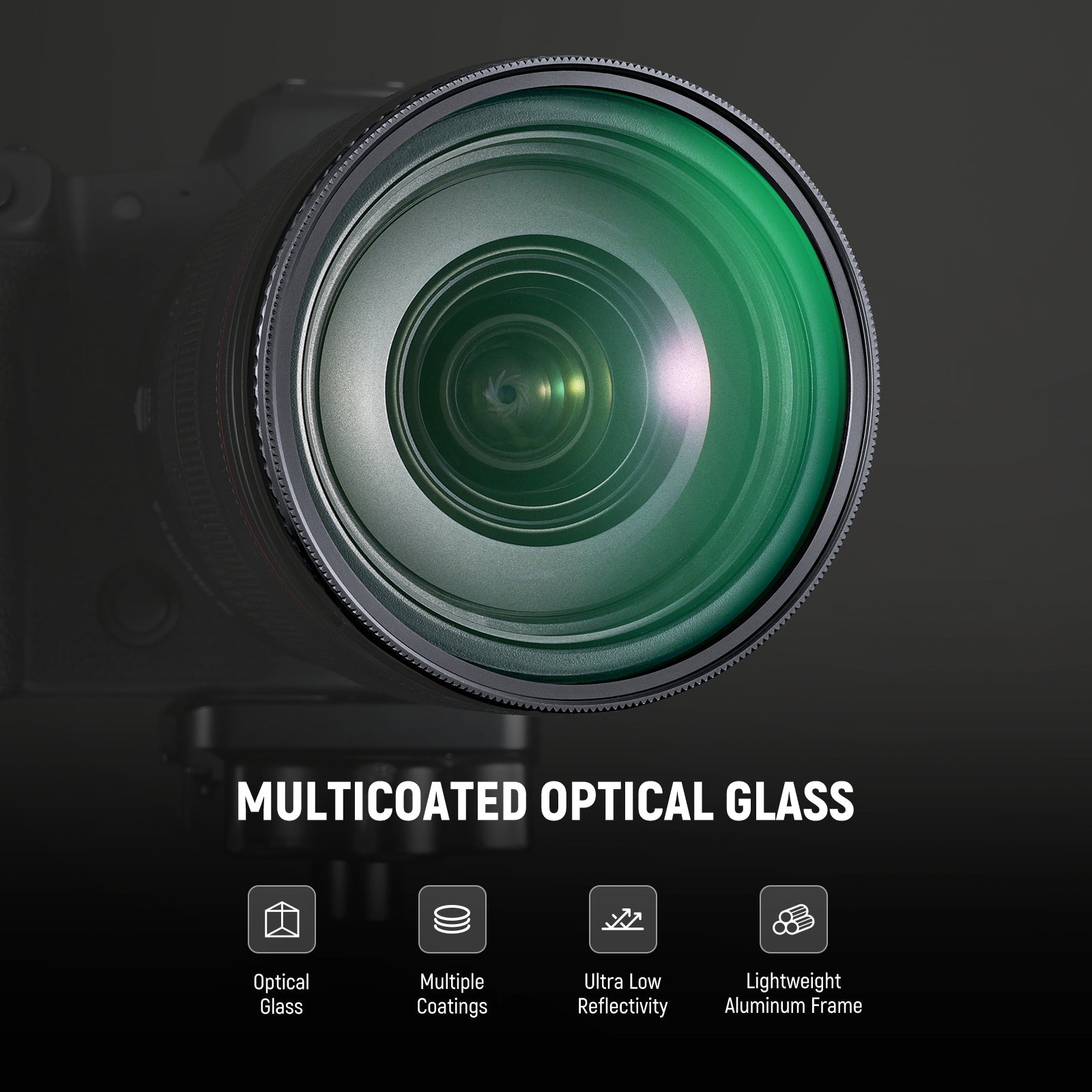 - Slim & Tough Aluminum Frame- Crafted from solid aluminum alloy with precise CNC threading, the slim frame withstands demanding outdoor environments, avoids vignetting on wide angle lenses, and ensures effortless installation