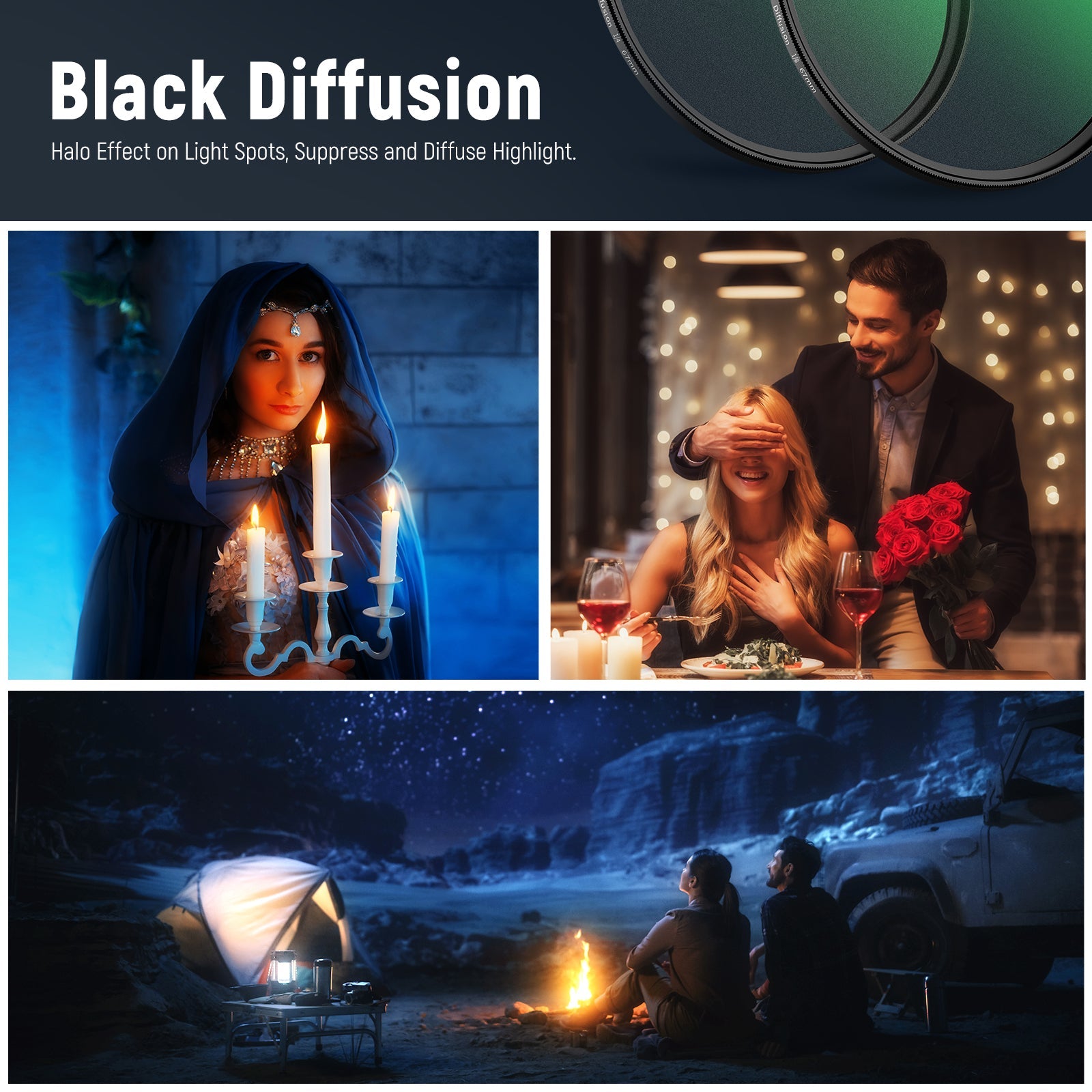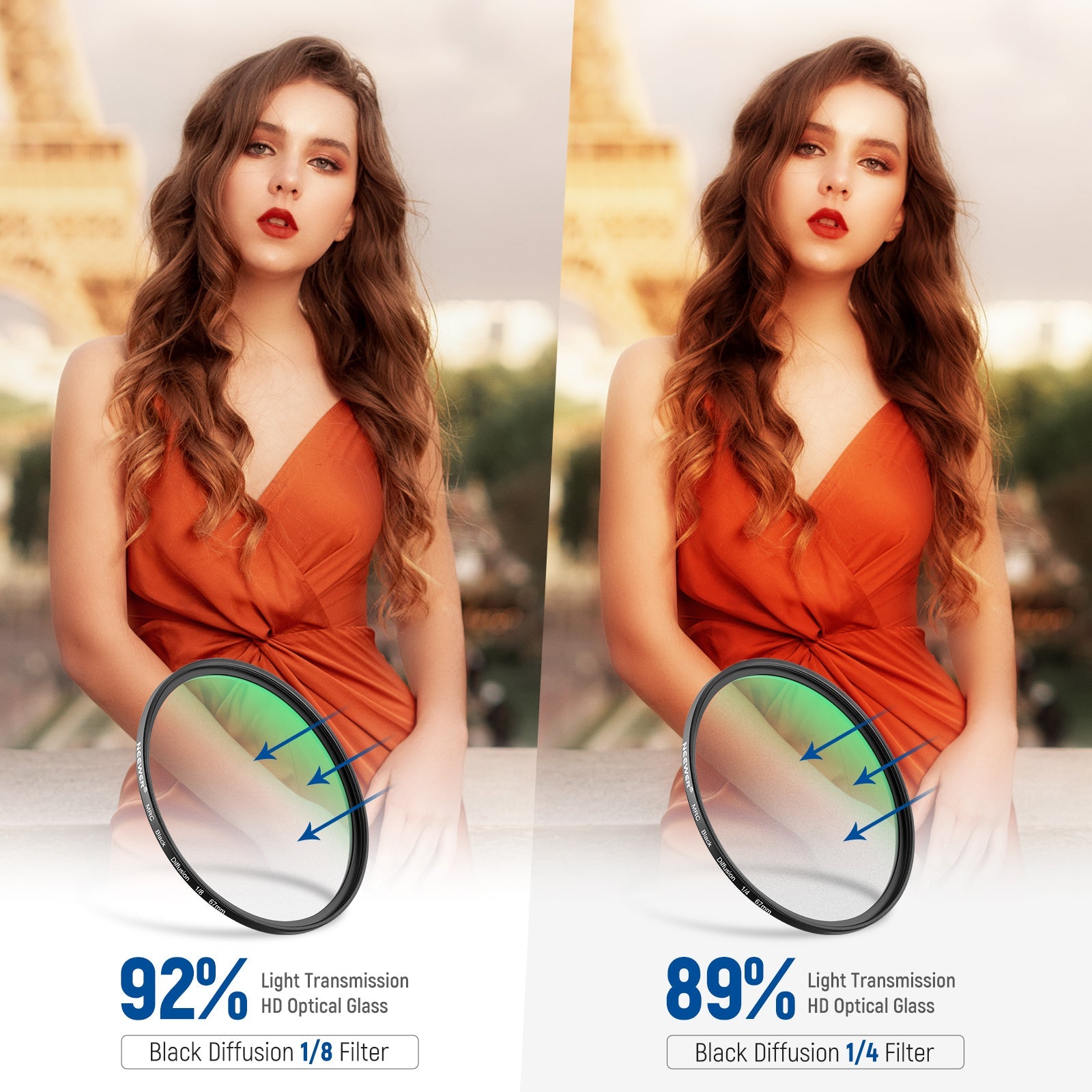 - Cinematic Effect Lens Filters- NEEWER 49/55/58/67/77/82mm black diffusion camera lens filters create cinematic effects with 1/4 & 1/8 density. The filters help reduce highlights and lower the glare, making the skin look smoother and giving the tone a hazier and softer look. With the dreamy hazy film effects, they are ideal for portrait photography, video recording, and vlog
