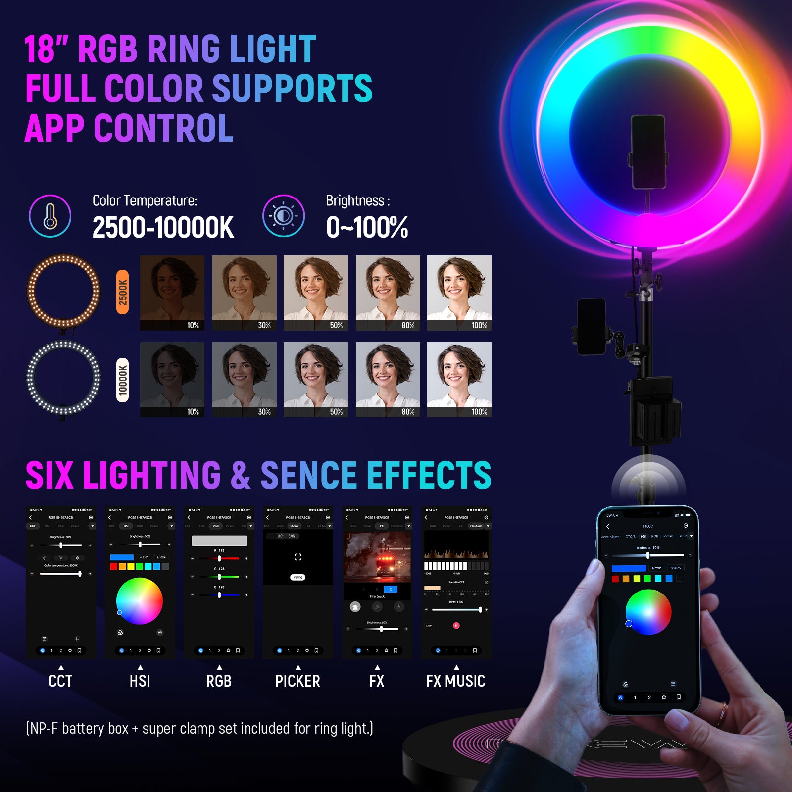 - 18" RGB Ring Light- The NEEWER RGB18 (II) features excellent 360° full color light with 180° adjustable tilt. It offers six dimming modes, including CCT/HSI/RGB/Picker/FX/FX Music, and supports preset scene light effects that sync with the music. With an adjustable color temperature range of 2500K to 10000K and a high CRI97+, it is perfect for multi person fill light needs. Bluetooth remote control via the NEEWER app enhances its usability