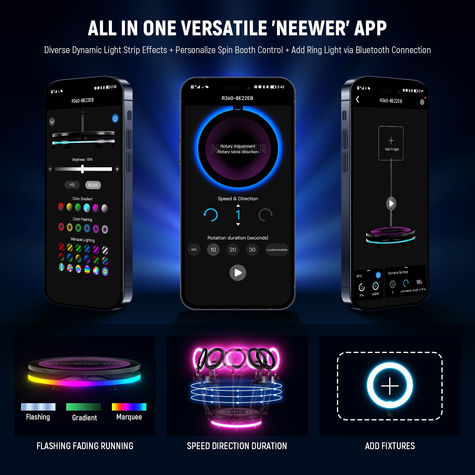 - Smart APP Control- Download the "NEEWER" app and connect via Bluetooth to the NEEWER R360 photo booth and the ring light for more functions. Easily control the light strip effects, 36,000 HSI light color combinations, and 30 preset light effects. Personalize rotating settings on your phone: select rotation direction, speed levels, and rotation times to achieve diverse shooting effects