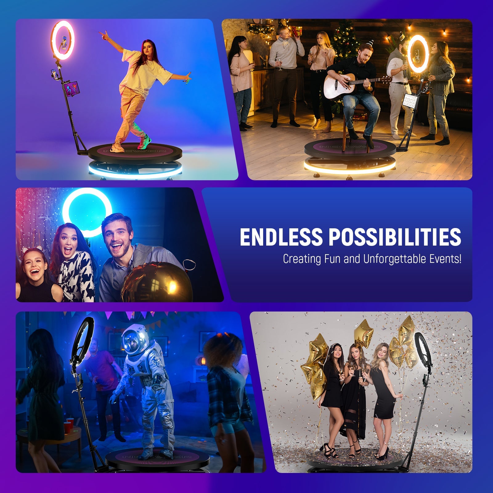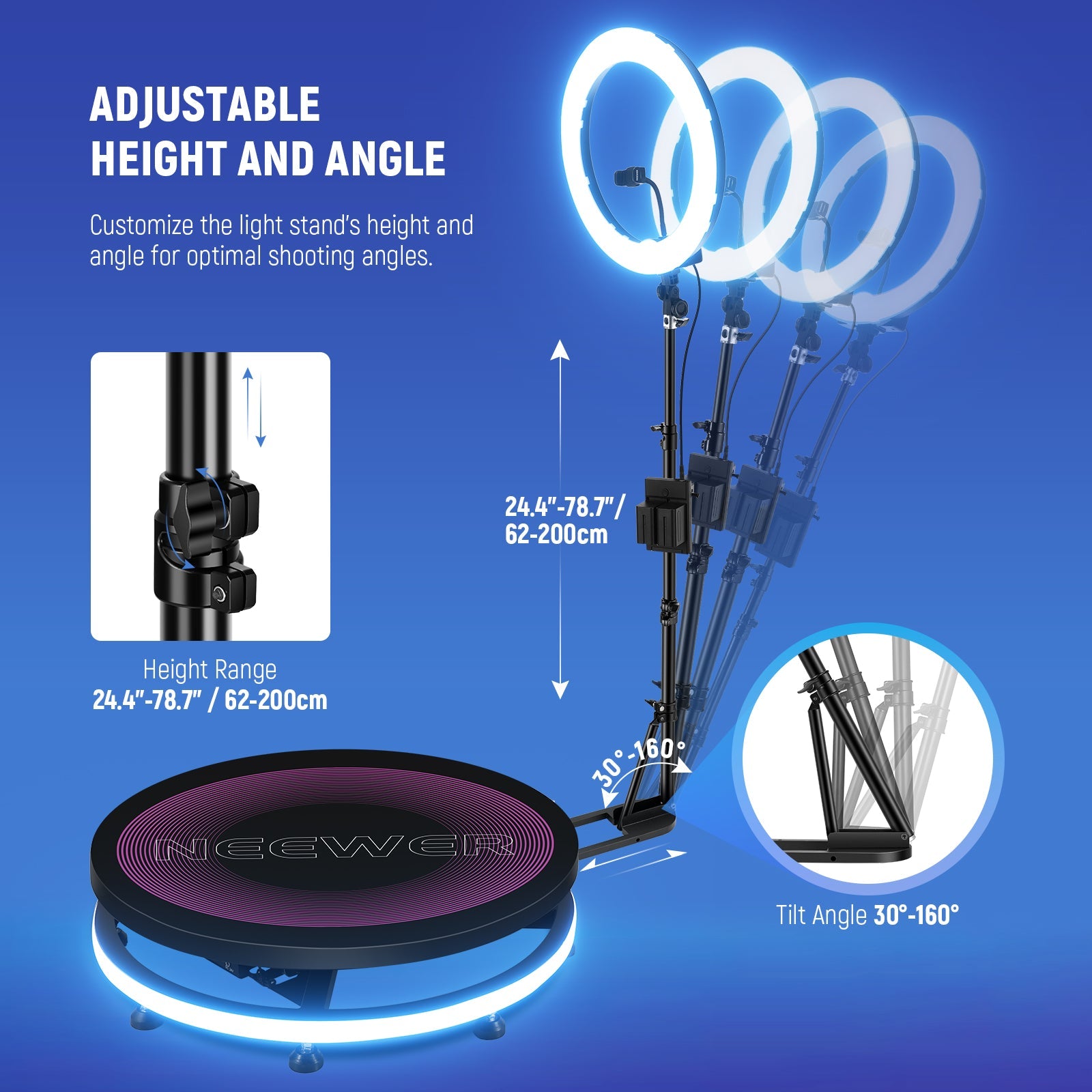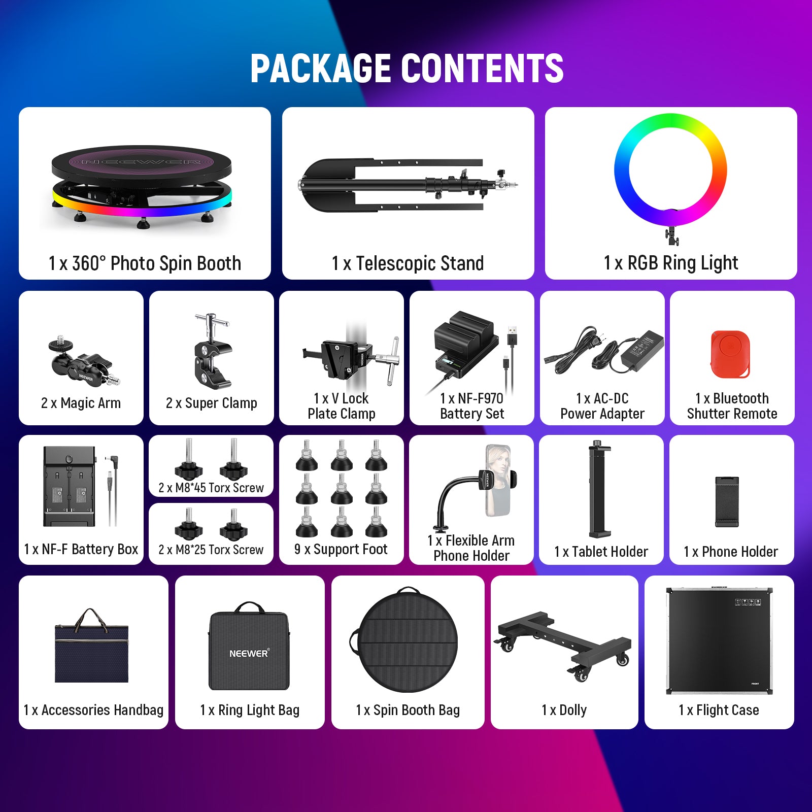 - 360° Panoramic Selfie Photo Booth- Introducing the NEEWER 360 Photo Booth Kit, an all in one solution for content creators and YouTube/TikTok streamers. It combines a 100cm/39.4" 360° Spin (customizable image cover), RGB LED strip, and RGB 18” ring light with APP control, and various accessories supporting multiple devices. Ideal for 360° shots, HD slow motion, GIF, and video for 1-3 people or objects, taking your artistic and commercial ventures to the next level