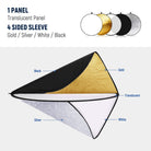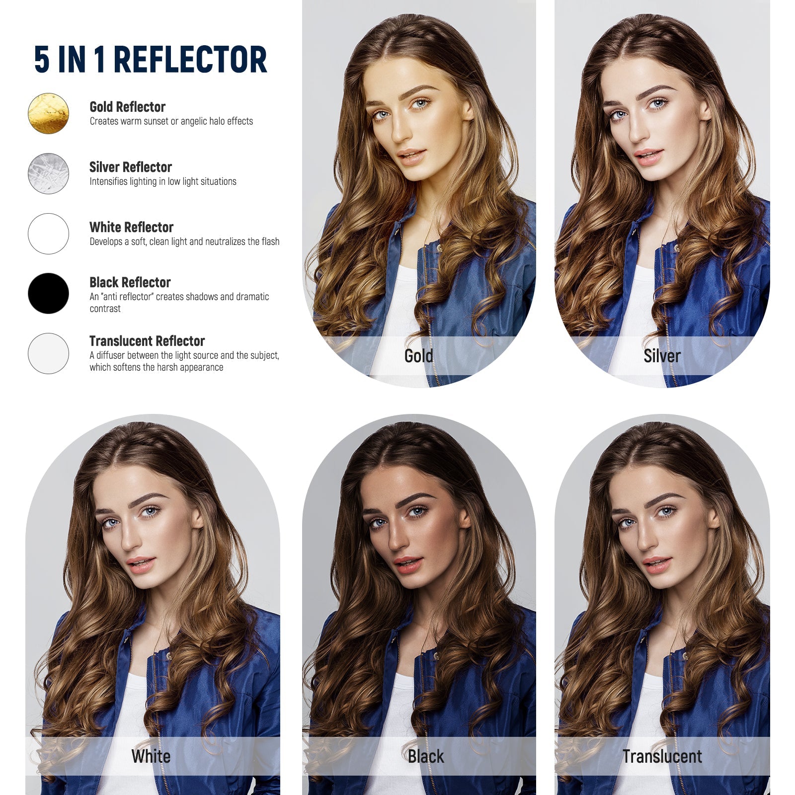- Get 5 Light Effects At Once- This 5 in 1 reflector kit contains a translucent diffusion panel and a reversible sleeve with 4 colors: gold for warm fills, silver for cool and crisp fills, white for soft neutral fills, and black for excessive reflection reduction