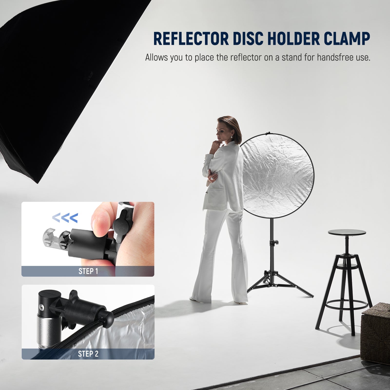 - Universal Metal Reflector Clamp- The holder clip can mount and secure the reflector on any light stand with a 5/8" stud. Due to the spring mechanism, it is easy to operate. Besides, you can directly use the reflector by hand