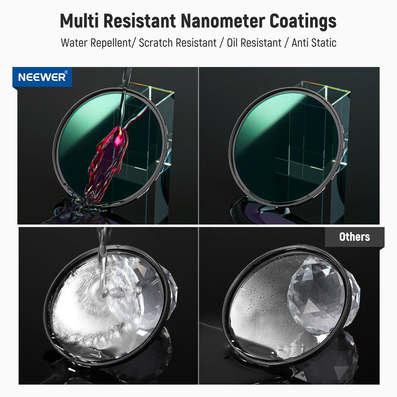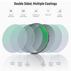 - HD Optical Glass with Multiple Resistant Nano Coatings- With high-quality HD optical glass and 30 layers of nanocoatings on both sides of the filters, the reflectivity can reach less than 0.1% to reduce flare and ghosting. Protect the filter from water, oil, dust, and scratches