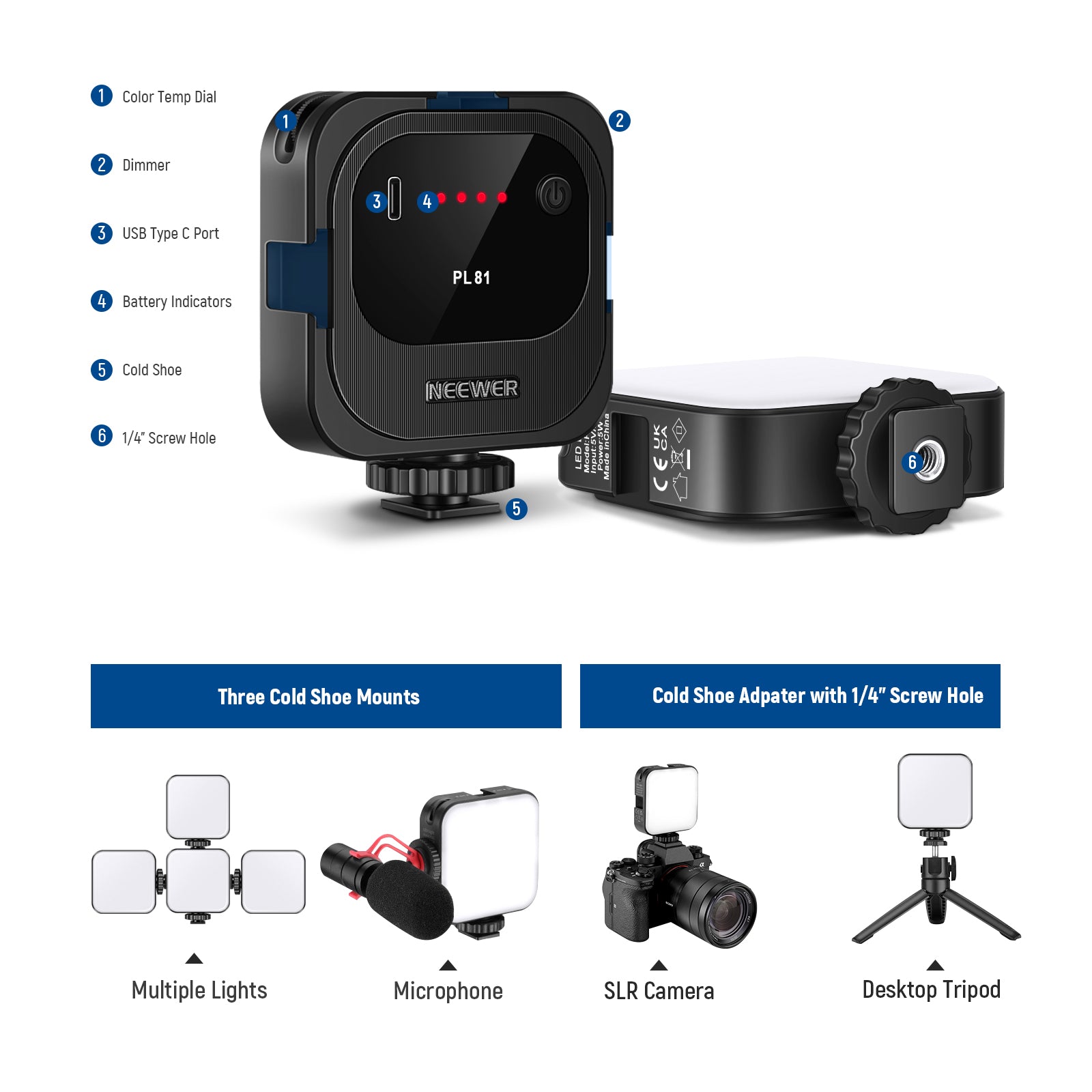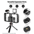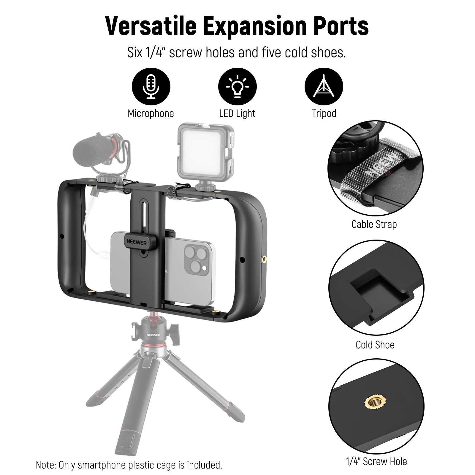 - Multiple Mounting Points- Five cold shoe mounts and six 1/4" threaded holes connect various accessories to the rig, such as a compact LED video light, an RGB light, a mini microphone, and a top handle. Helps make up a complete vlogging and photo-video shooting equipment to take your work to the next level