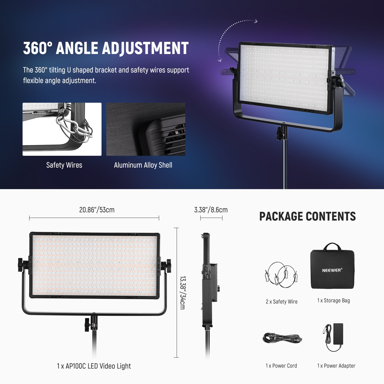 - APP/2.4G/Panel/DMX Control- AP100C offers four control methods for versatile use in complex lighting environments. Adjust brightness and control optical groups through the NEEWER APP, connect to other NEEWER lights (SL90 PRO, RGB1, RGB1200, MS60C, MS60B, MS150B, FS150C, FS300C, BH30S, HB80C, HS60C, CB60C, CB60B, etc.) for coordinated lighting, and make parameter adjustments easily with the color display and knob. A 5 pin DMX port can connect to a DMX console for stage lighting management