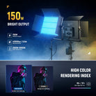 - Pro 150W RGB Panel Light- The AP150C features an advanced LED optical design and a TIR lens module of exceptional light transmission, delivering premium, penetrating light. The powerful 150W output combined with 1800 superior LEDs generates an unparalleled illumination up to 42500Lux/0.5m, with a high CRI of 96+ and TLCI over 97 to reproduce the true colors. Plus, warm & cold modes are freely switched by adjusting within 2500K-10000K, ideal for videos, interviews, products, portraits, etc