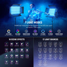- 7 Lighting Modes & Accurate Dimming- With RGB and cool & warm LEDs blended, the panel light boasts powerful color performance, achieving 90% coverage of the Rec.2020 color space through RGBWW mixing technology. It offers 7 lighting modes: CCT/HSI/RGBCW/GEL/FX/XY/SOURCE, of which FX presents 18 scene effects and SOURCE includes 17 light source matches. While the PWM technology enables precise dimming with 0.1% increments across 0-100% and provides 4 dimming curves for diverse lighting setups