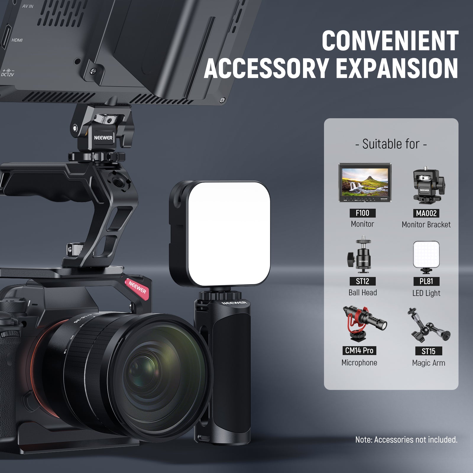 - Convenient Accessory Connection- The Top Handle and the Side Handle Grip are designed with multiple 1/4" threads, 3/8" threads with ARRI locating holes, and cold shoes for mounting magic arms (UA012/ST15), monitor mounts (MA002/MA004), LED lights (PL81/RGB62), microphones (CM14 PRO), and other peripherals for enhanced video quality