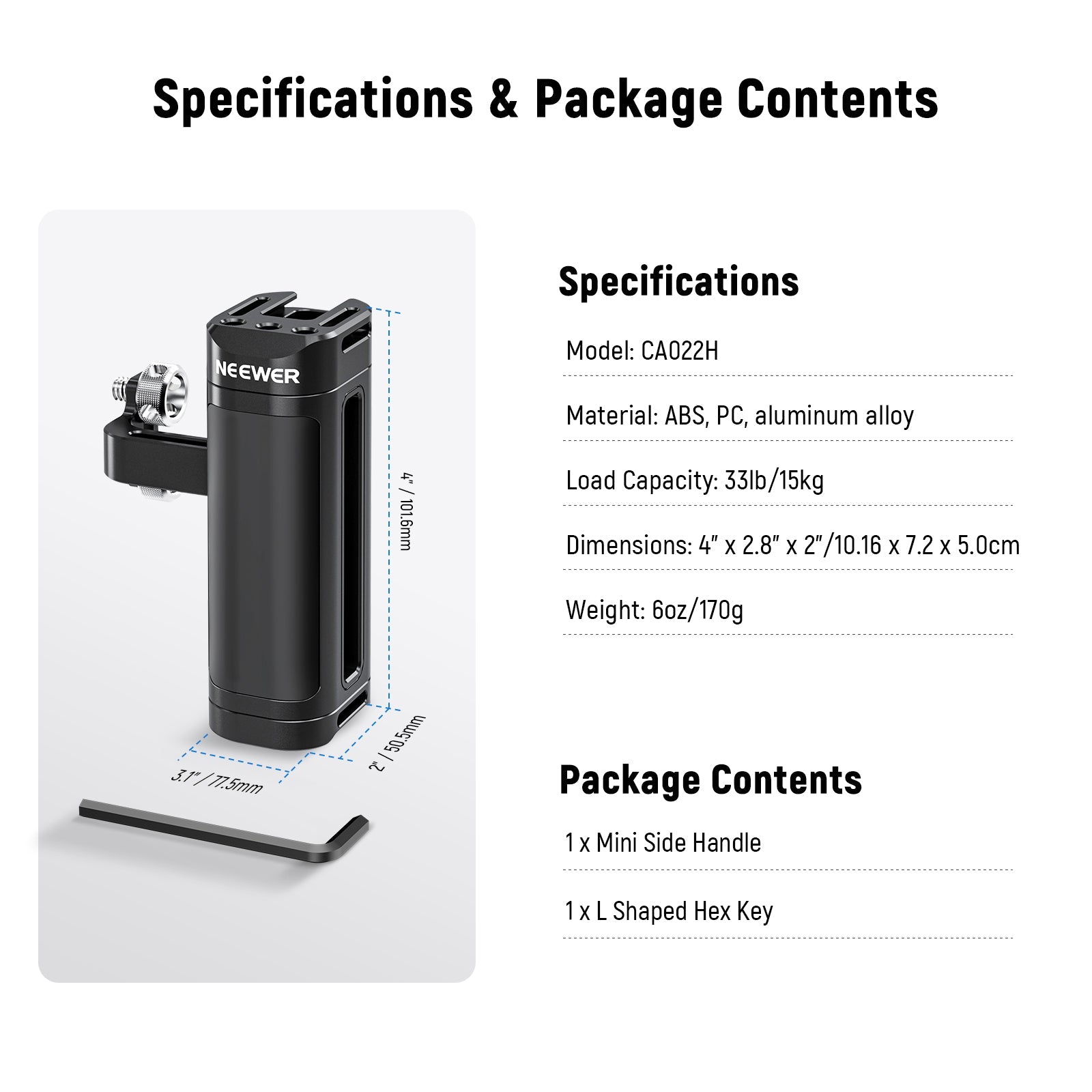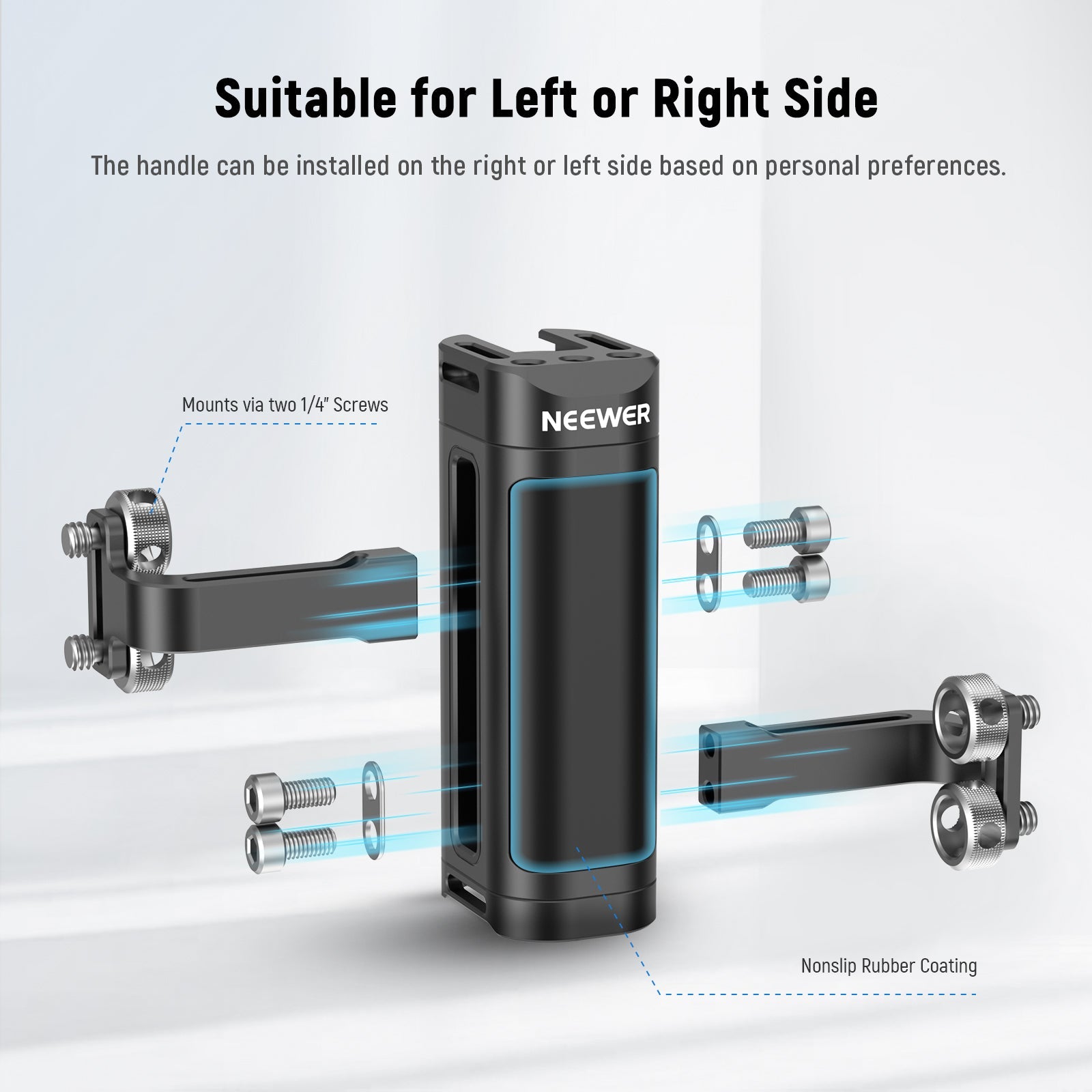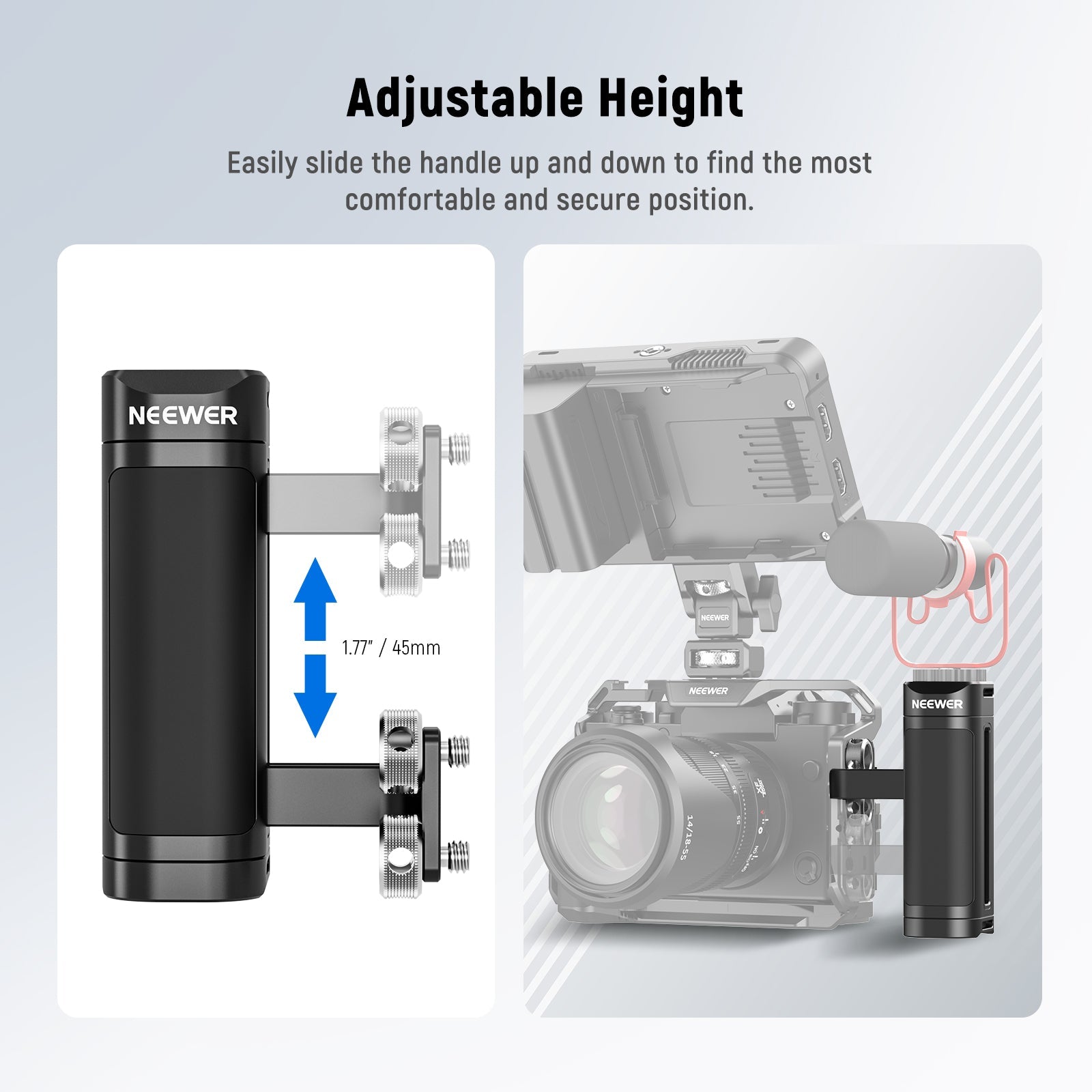 - Ultra Lightweight Universal Side Handle- This compact and lightweight (6oz/170g) side handle attaches to your camera cage or video rig via two 1/4" thumbscrews. With adjustable 0.7"-0.8" (18-20mm) screw spacing, it is compatible with SmallRig cages and numerous NEEWER camera cages (CA020 CA019 CA014 CA011 CA002) and helps you stabilize a DSLR or mirrorless camera of up to 33lb (15kg) (Not compatible with Tilta)