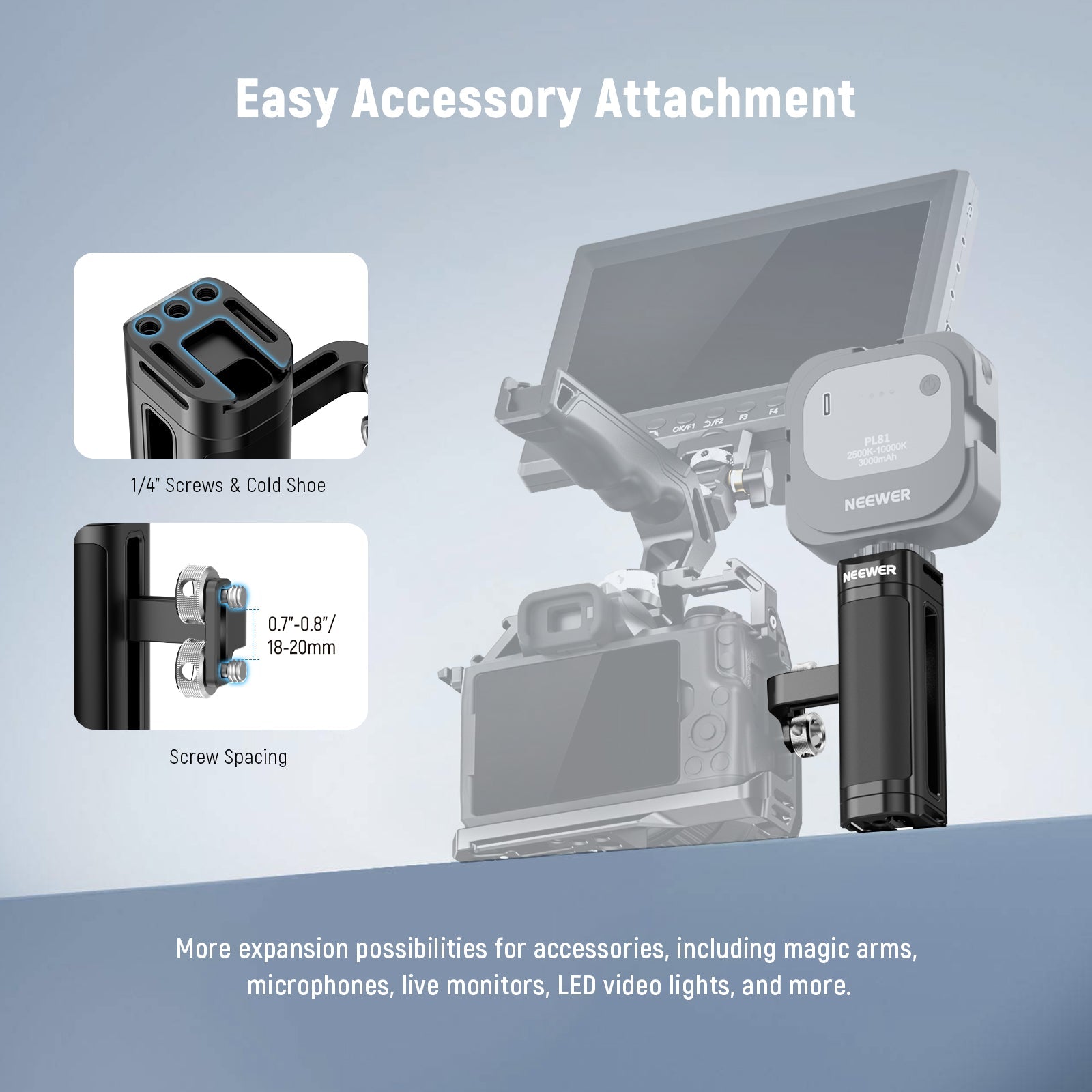 - Easy Accessory Attachment- 1/4" thread holes on the top and bottom can connect magic arms, ball head mounts, and other small accessories. And a cold shoe mount can connect an LED light, microphone, or monitor for improved shooting quality