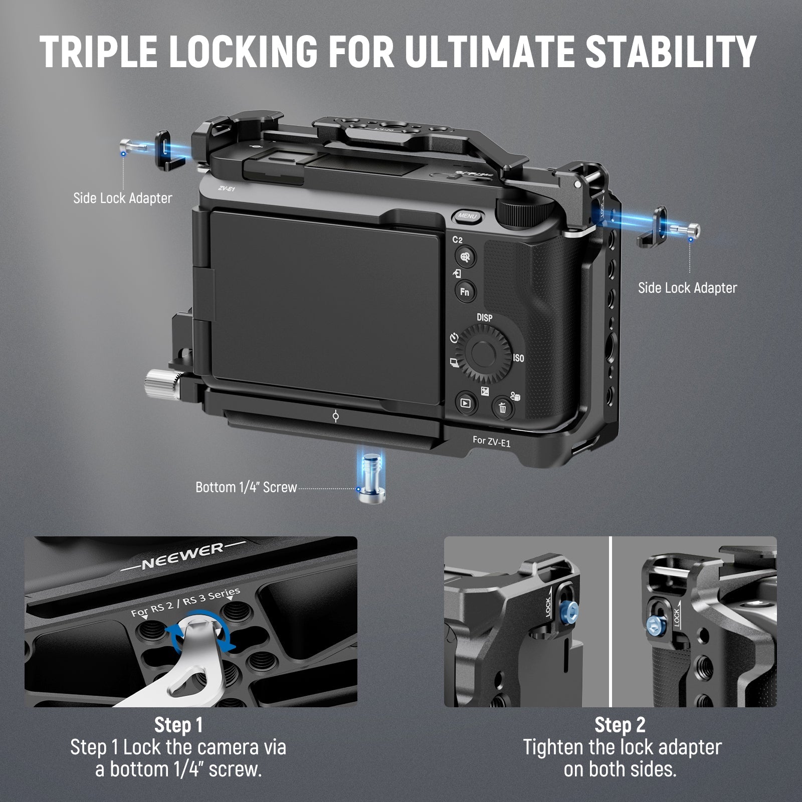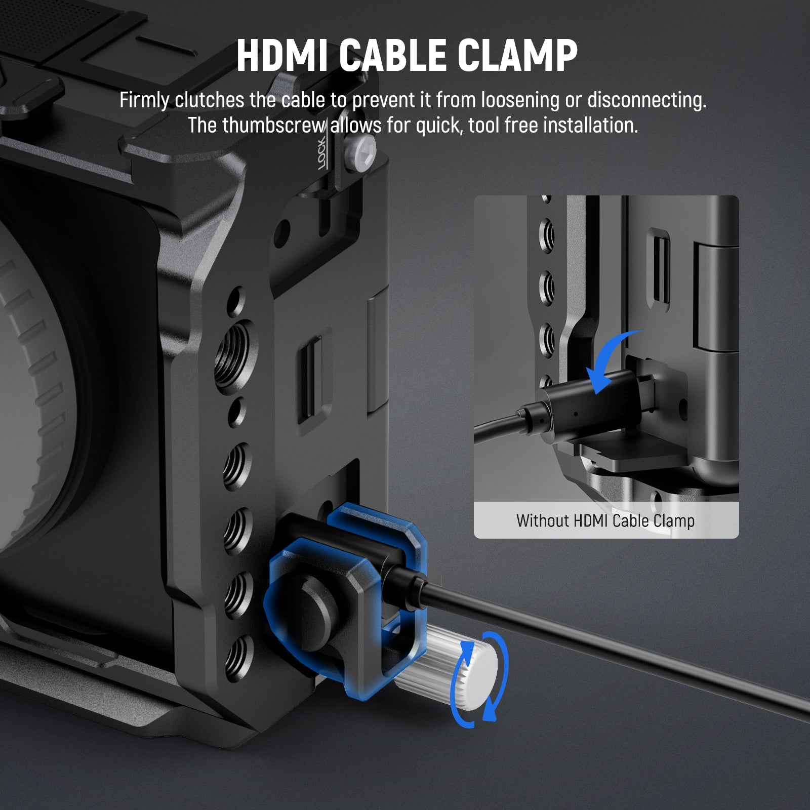 - Triple Locks & HDMI Cable Clamp- Tightly fasten your ZV-E1 camera via a 1/4" bottom screw and two side screws with a rubber pad to avoid scratches. The detachable HDMI cable clamp fixes the cable for stable signal transfers and can be installed by hand without tools