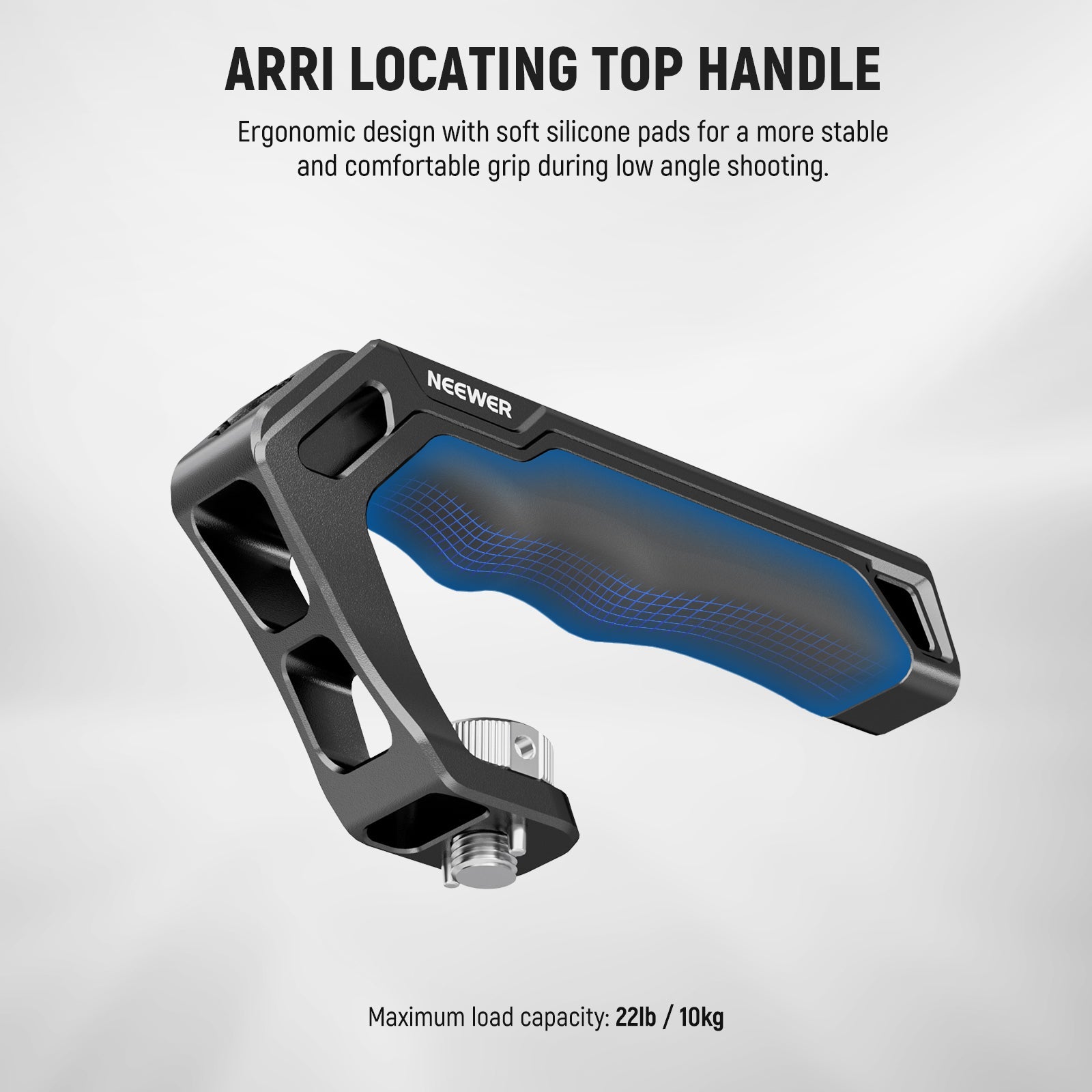 - 3/8" ARRI Locating Top Handle- Includes an ergonomically designed top handle that can be attached to any camera cage with a 3/8" screw and ARRI locating pins, and securely supports up to 22lb/10kg. Also with 4x 1/4", 2x 3/8" threads, ARRI locating holes, and 3x cold shoe mounts to attach more accessories. Its contoured outline easily fits in your hand and the soft silicone coating adds friction for stable low angle shooting