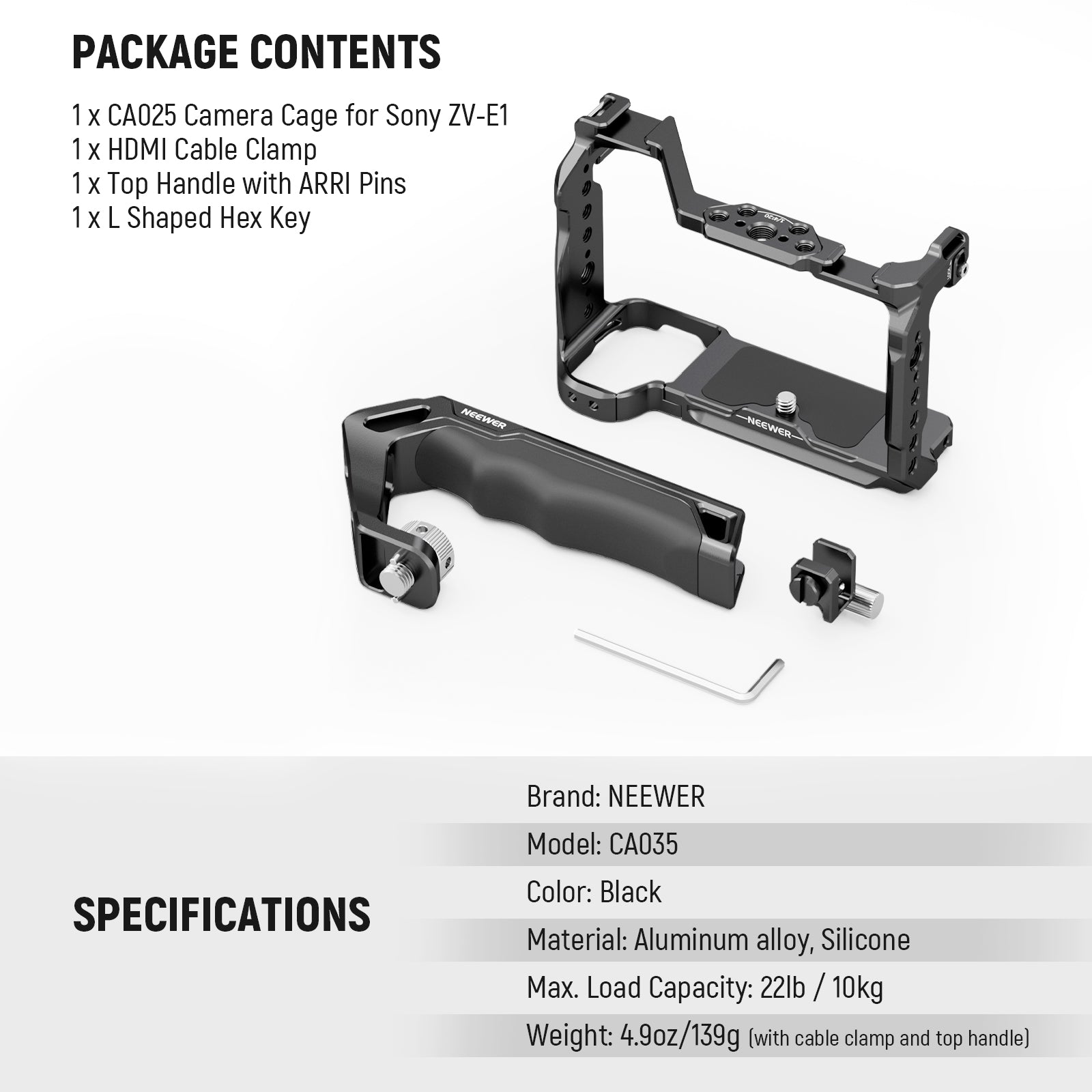- All in One Full Cage Kit for ZV-E1- Fully compatible with Sony ZV-E1 cameras. This lightweight yet durable aluminum alloy camera cage provides all round protection for your camera while granting full access to buttons, ports, battery compartment and the tilting LCD screen. It offers wider expandability and includes a top handle for flexible angles, a detachable HDMI cable clamp for stable signal outputs, and weighs a total of 4.9oz/139g for your outdoor photography
