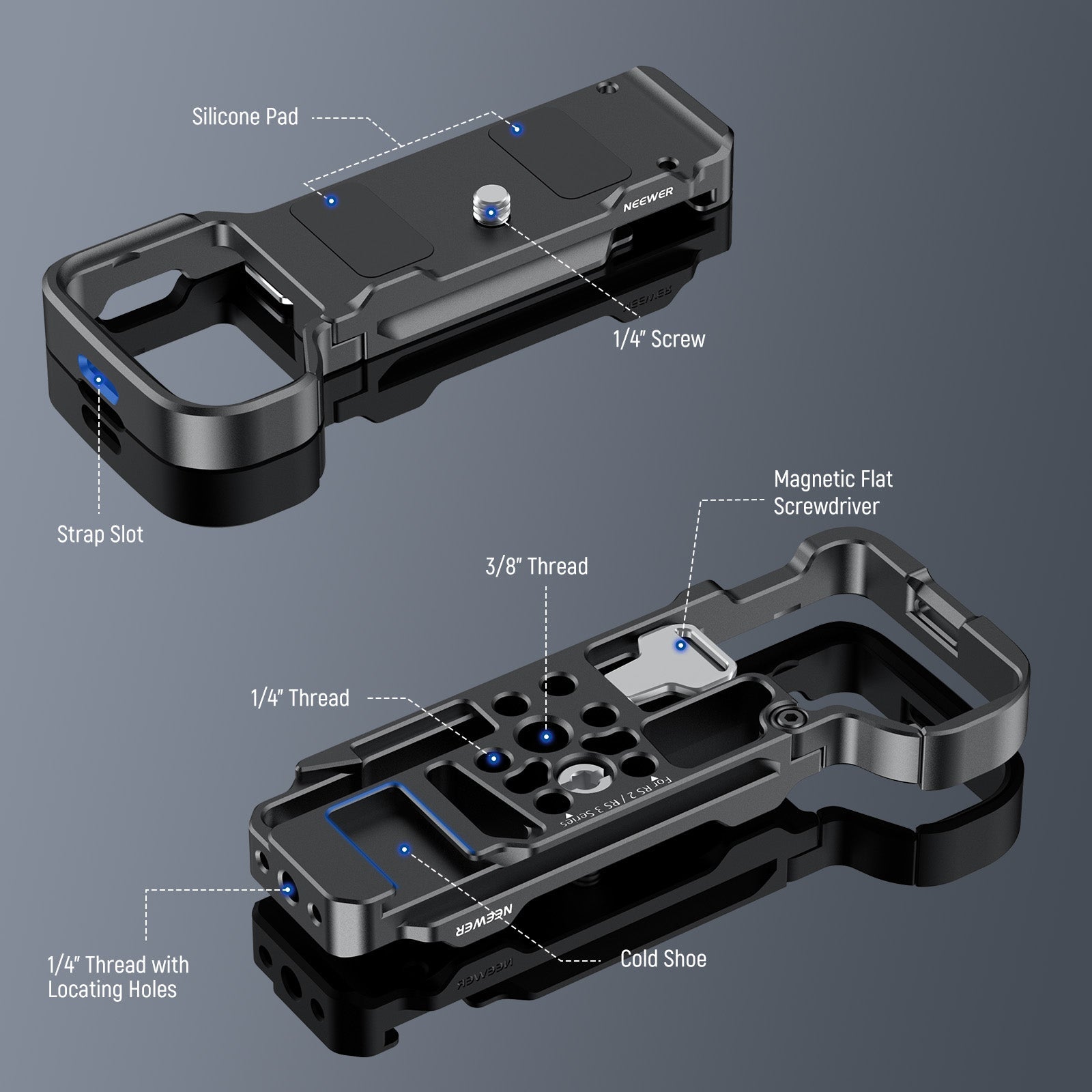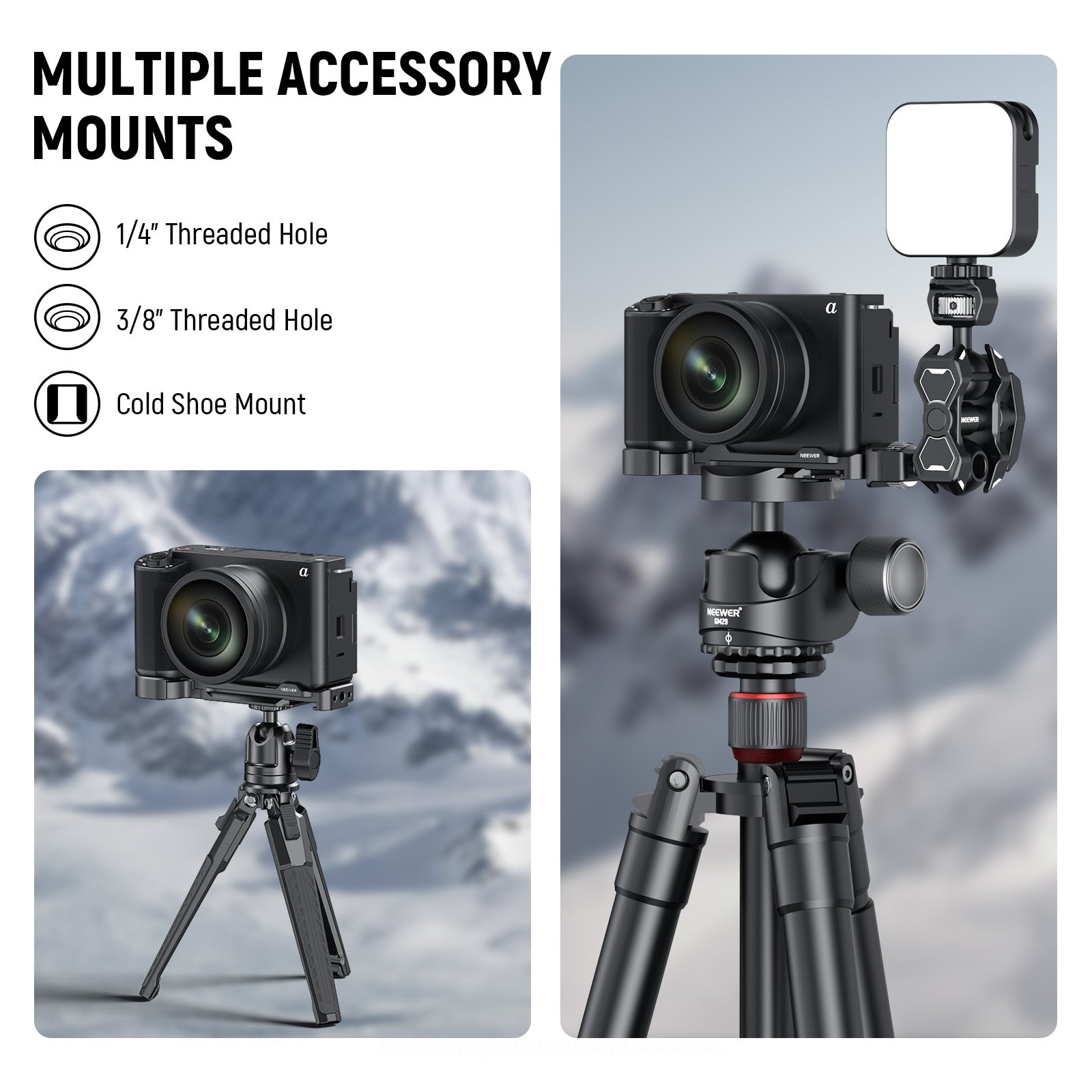 - More Accessory Mounting Points- Includes 1/4" and 3/8" threads on the bottom to mount the baseplate on a tripod, a camera stand, or a handgrip. A 1/4" thread with locating holes on the side can securely connect the NEEWER UA009 Magic Arm, and a cold shoe can accept NEEWER RGB62/PL81 LED video light or CM14 Pro microphone. Also compatible with other 1/4" mountable accessorie