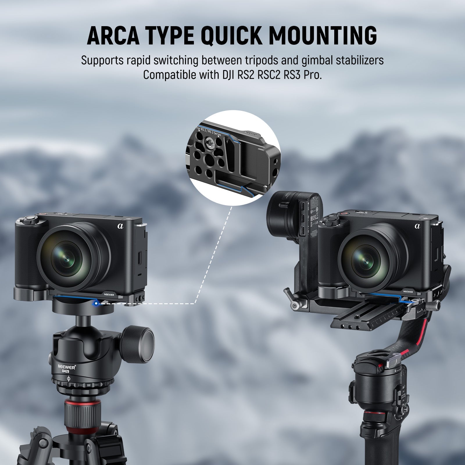 - Quick Switch Between Tripod/Gimbal- The Arca type baseplate is compatible with DJI RS 2/RSC 2/RS 3/RS 3 Pro gimbals and numerous tripod heads, so you can seamlessly transfer the camera from a tripod to a handheld stabilizer for different video styles