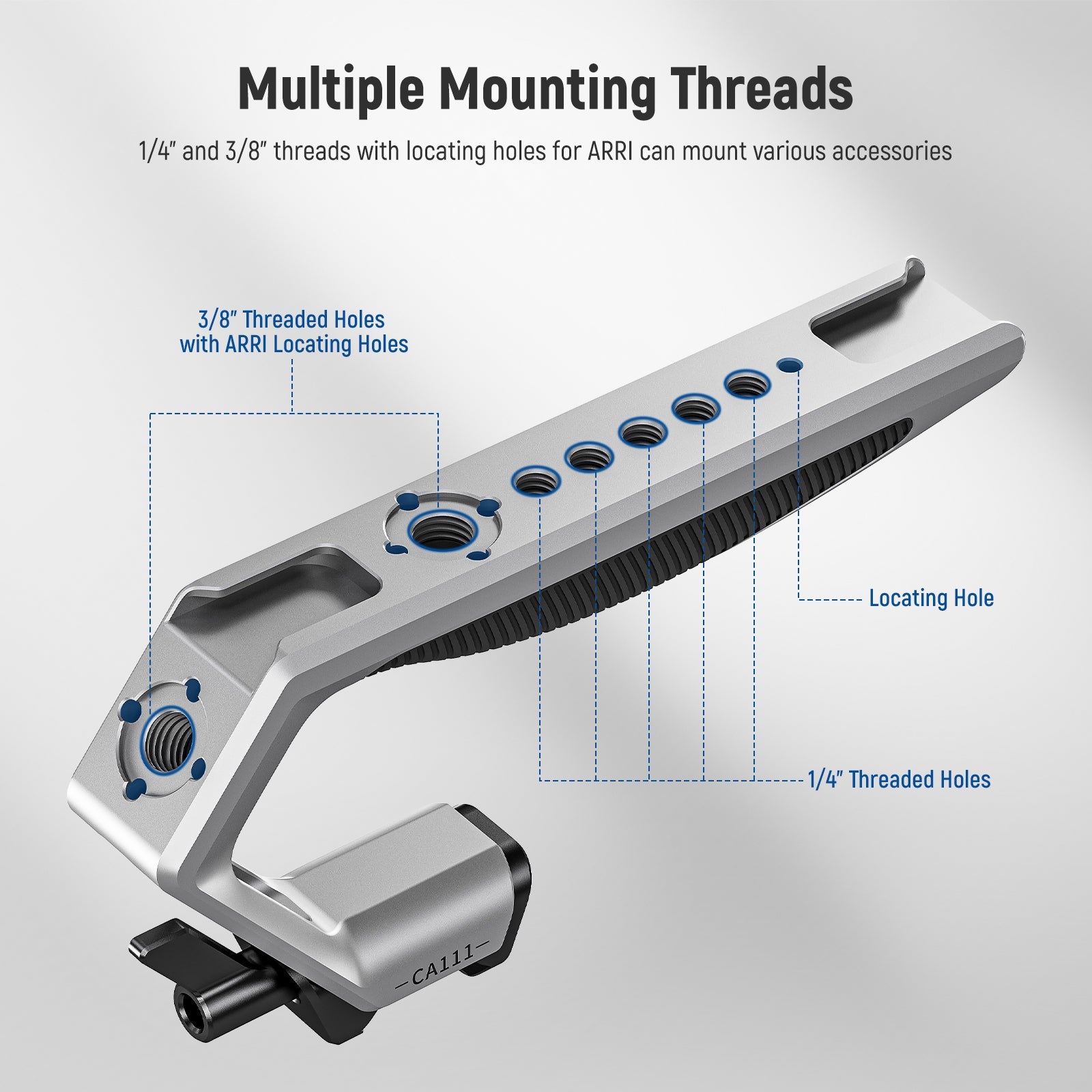 - Multiple Mounting Threads- 1/4" and 3/8" threads with locating holes for ARRI can mount various accessories, including magic arms, clamps, counterweights, and more