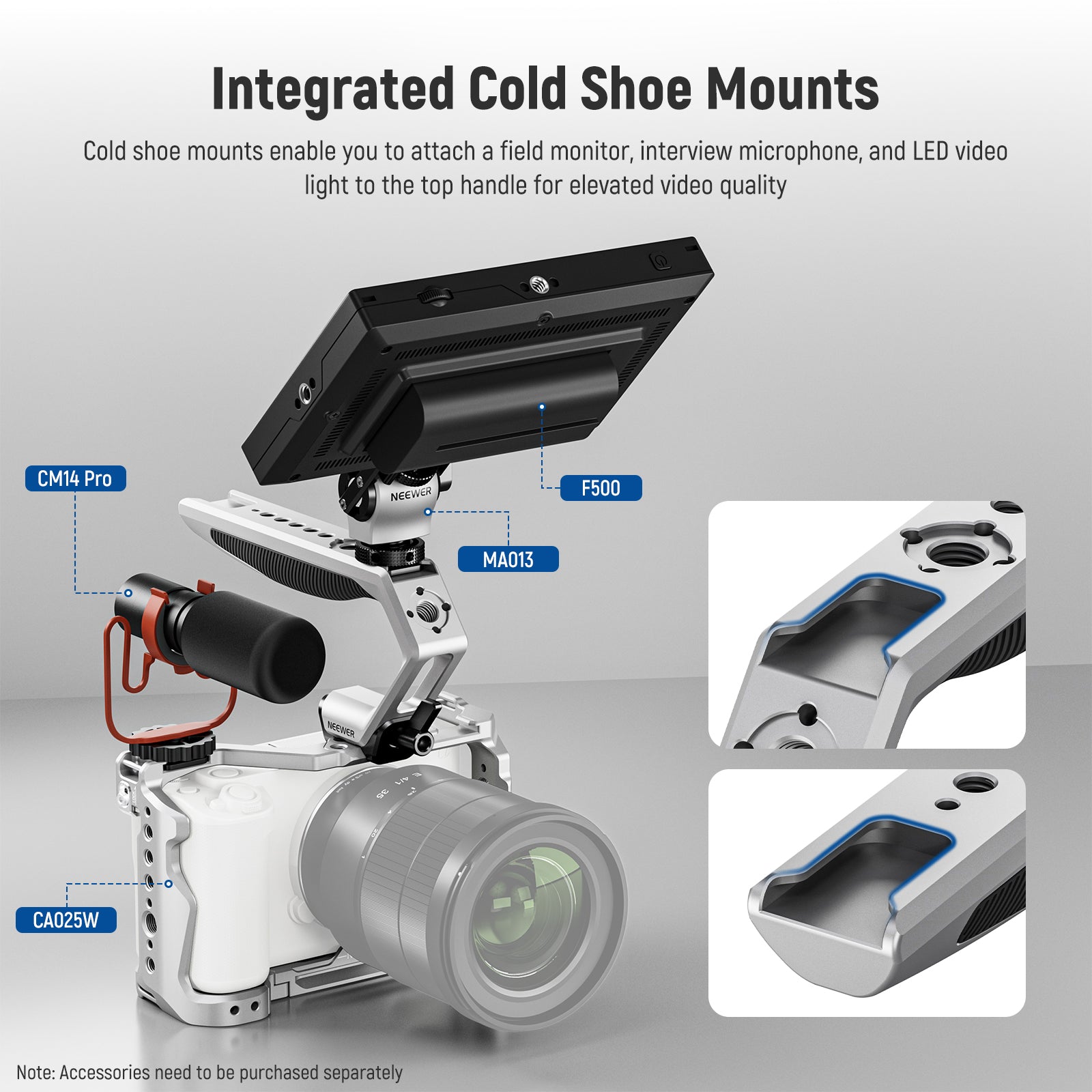 - Integrated Cold Shoe Mounts- Cold shoe mounts enable you to attach a field monitor, interview microphone, and LED video light to the top handle for elevated video quality
