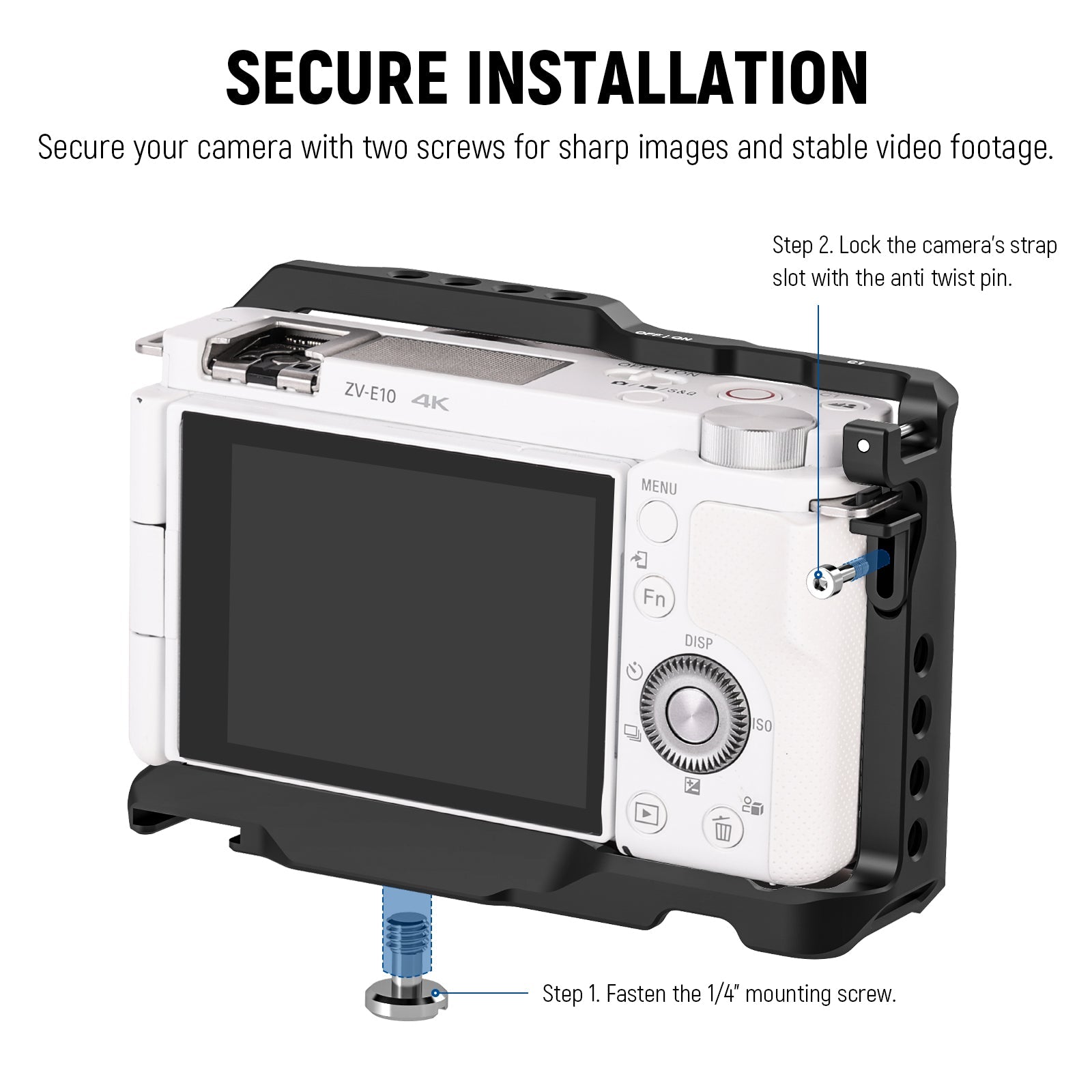 - Formfitting Camera Cage- Slim and lightweight, this camera cage is seamlessly compatible with Sony ZV-E10 Mirrorless Vlog Camera while retaining its portability and compactness. The 1/4” mounting screw and the anti twist pin fix the camera and prevent it from wobbling. And a screwdriver magnetically stored under the cage helps you adjust the screw tension with ease