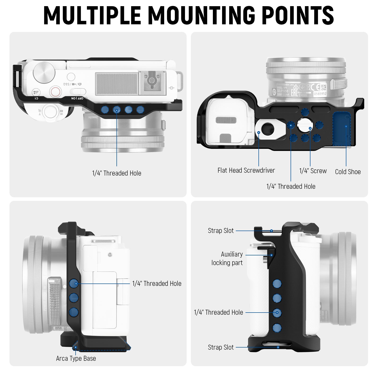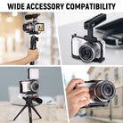 - Multiple Mounting Points- Abundant 1/4” female threads and a cold shoe mount maximize your accessory expansion options. For instance, magic arms, small microphones, and compact LED video lights can be attached to the cage for enhanced video quality