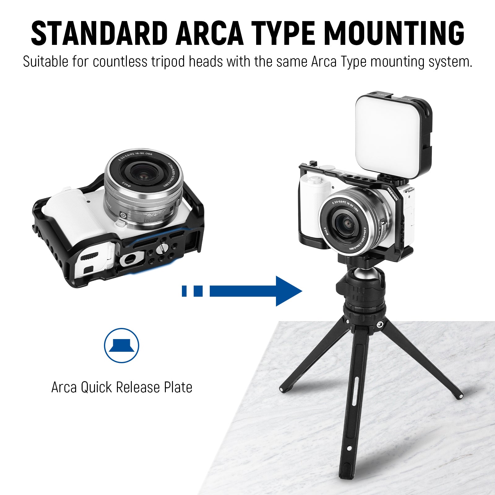 - Universal Arca Type QR Plate Base- With a standard Arca type base, the camera cage can swiftly mount on any tripod head compatible with the Arca Swiss mounting system
