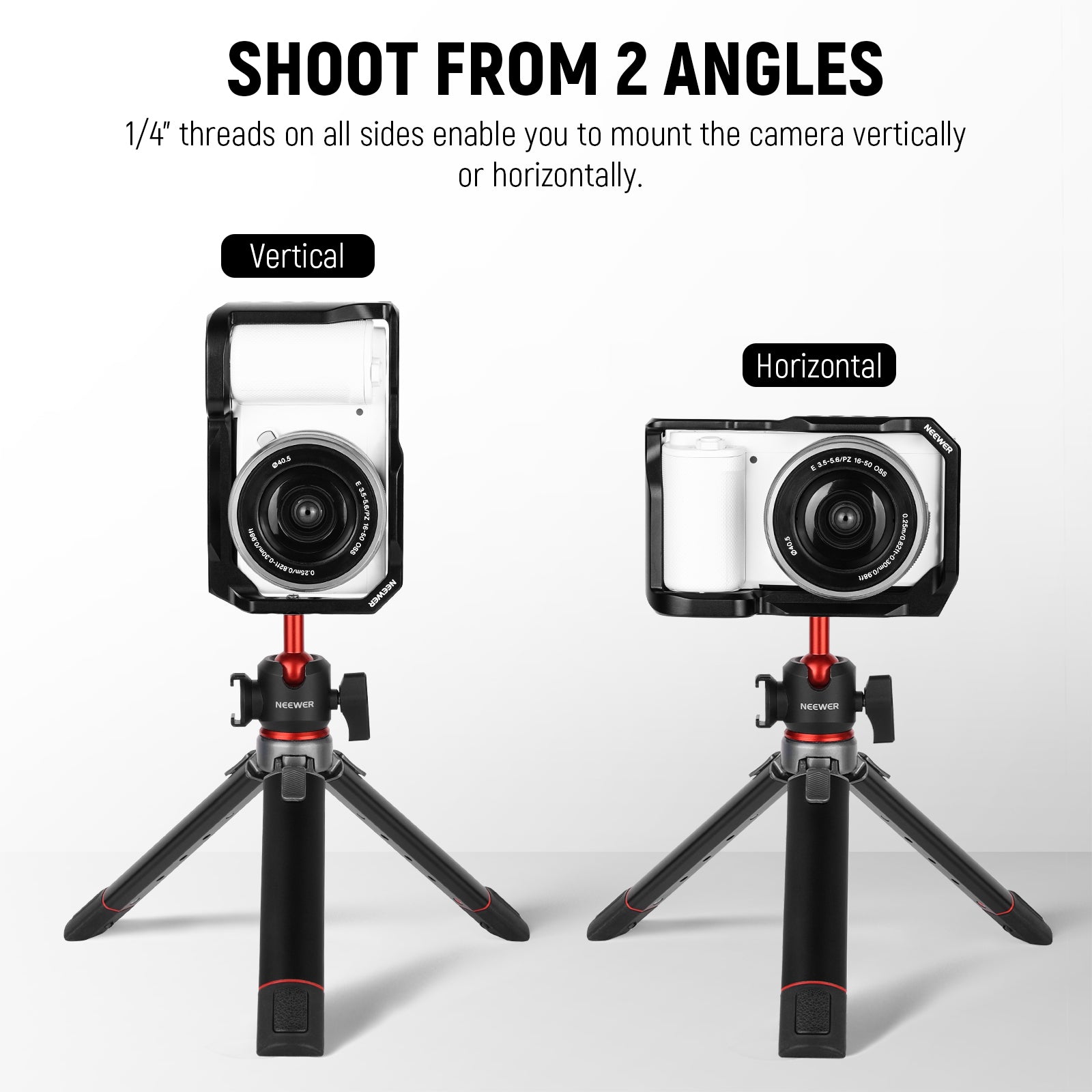 - Dual Directional Shooting- Each side of the camera cage features several 1/4” threads that enable you to mount your camera on a tripod or a handle grip in vertical and horizontal orientations