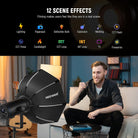 - 12 Scene Effects/Silent/Booster Mode- 12 preset lighting scene effects for adding eye-catching elements to your video creation. Supports one button Booster mode, which can provide about 210W power and 90000Lux/1m, while automatically turning on the fan to enhance heat dissipation. Silent mode provides about 60W power and 30000Lux/1m, the fan will remain off, suitable for children/pet photography.