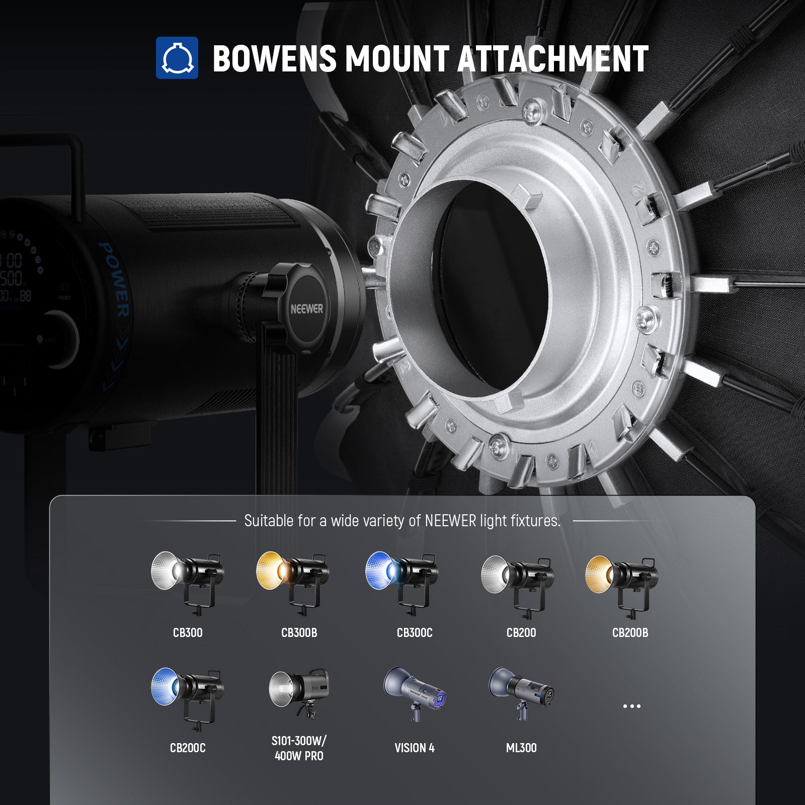 - Versatile Mountings & Upgraded U Bracket- The standard reflector with silver interior surface helps ensure that the light delivered is even. Bowens Mount attaches various light modifiers like reflectors, softboxes, and beauty dishes. The upgraded U-shaped bracket offers a 360¡ã adjustable beam angle. The enlarged knob with enhanced friction keeps the angle of the light stable. The umbrella jack is at the bottom of the light.