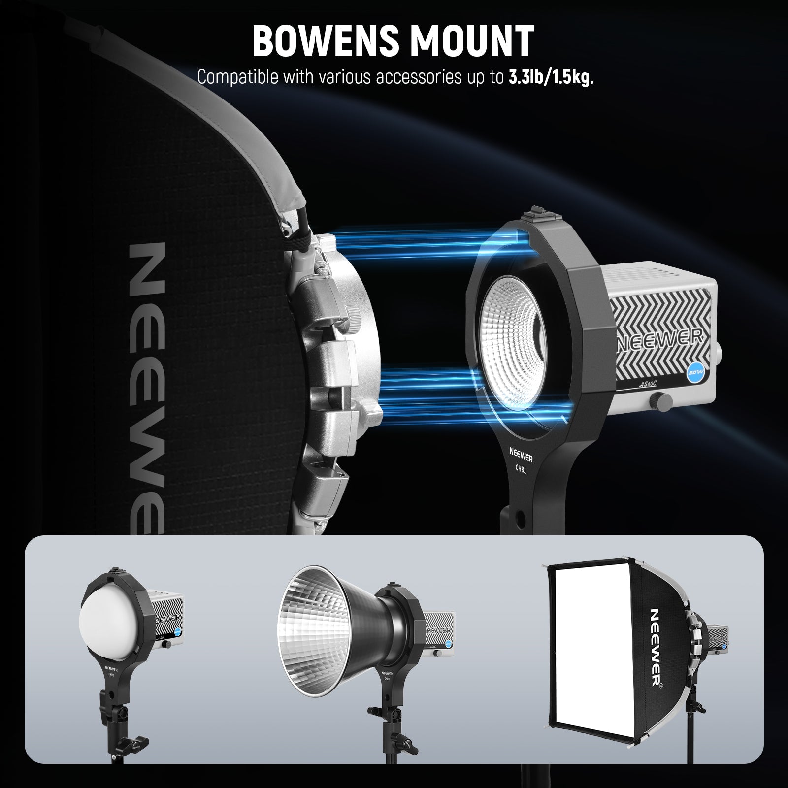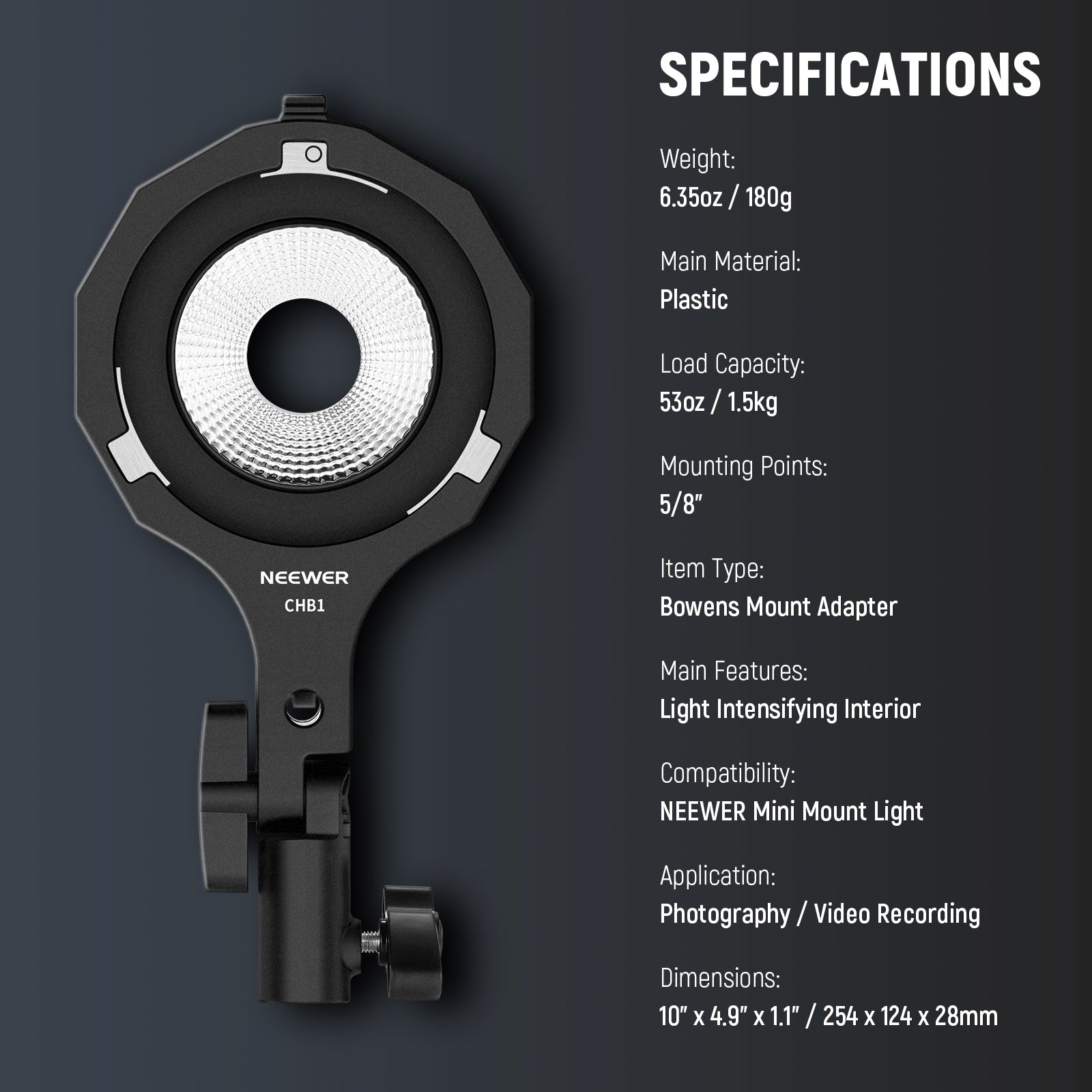 NEEWER Mini to Bowens Mount- CHB1 Bowens Mount Adapter makes NEEWER Mini Mount Lights (ONLY for HS60B &HS60C) compatible with all Bowens mount accessories and light modifiers, including standard reflector, parabolic softboxes, lantern softboxes, and Fresnel lenses, for expanded creative possibilities