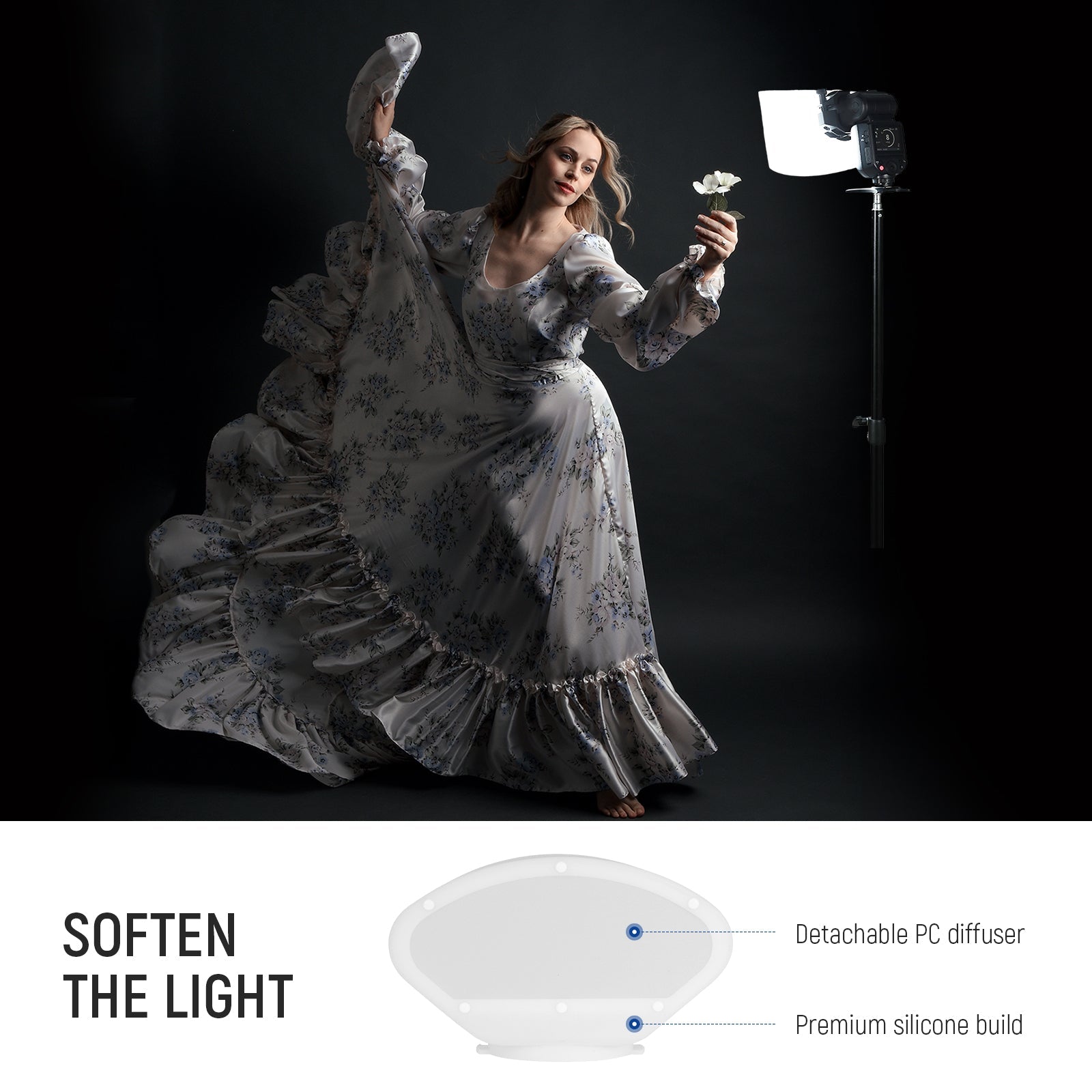 - Soften & Natural Diffusion- Crafted with premium silicone, this flash diffusion dome expands to a full size of 7.8" x 4.9" x 5.7" /197 x 125 x 145mm, provides just the right amount of transmittance that softens harsh light, reduces shadows, and provides a more flattering, natural illumination lighting for weddings, parties, portraits, product photography, beauty & fashion photoshoots, studios, live streaming, video recording, etc.