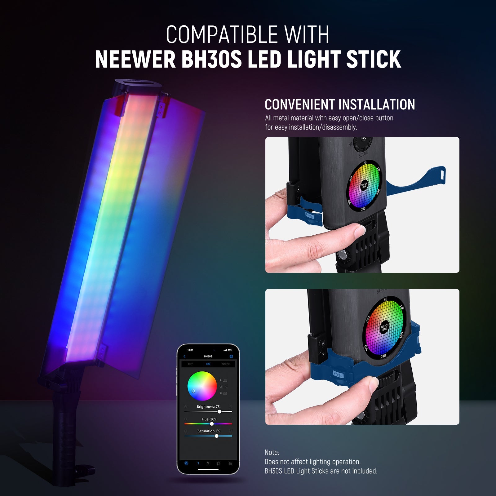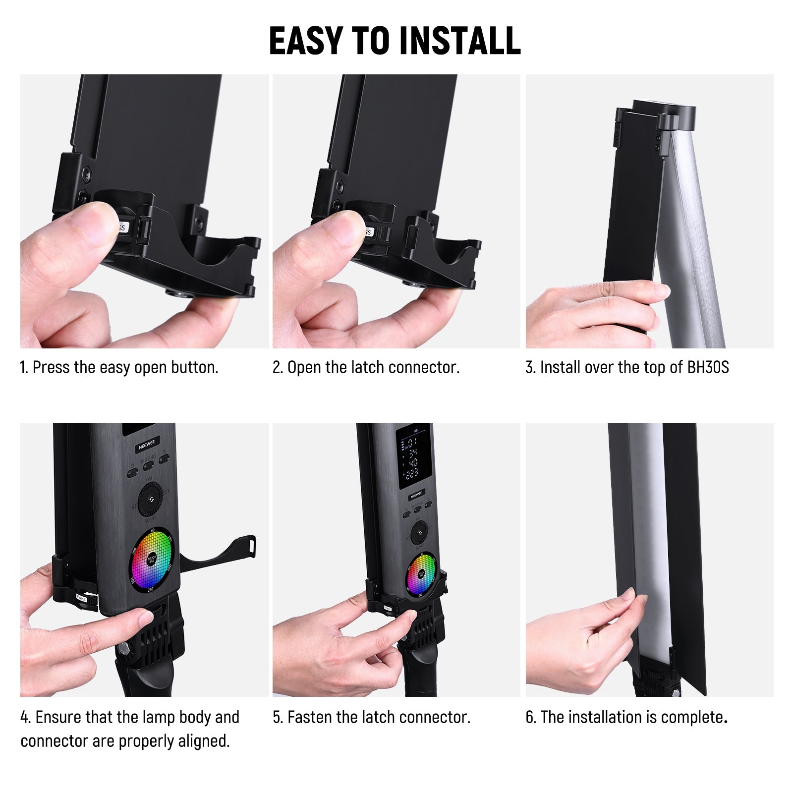 - Fast & Effortless Installation- Open the latch, insert the BH30S Light Stick into the barndoors, then lock the latch. The whole installation process is efficient and doesn't require any tool