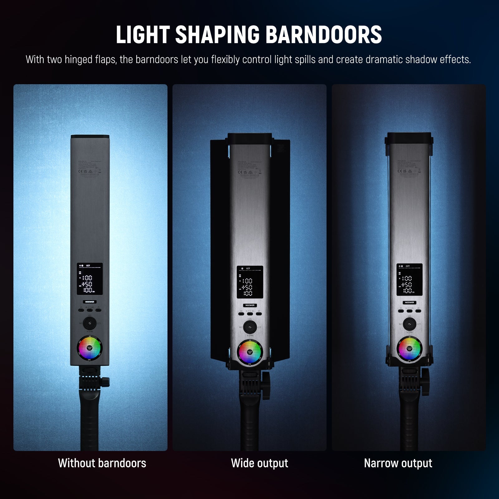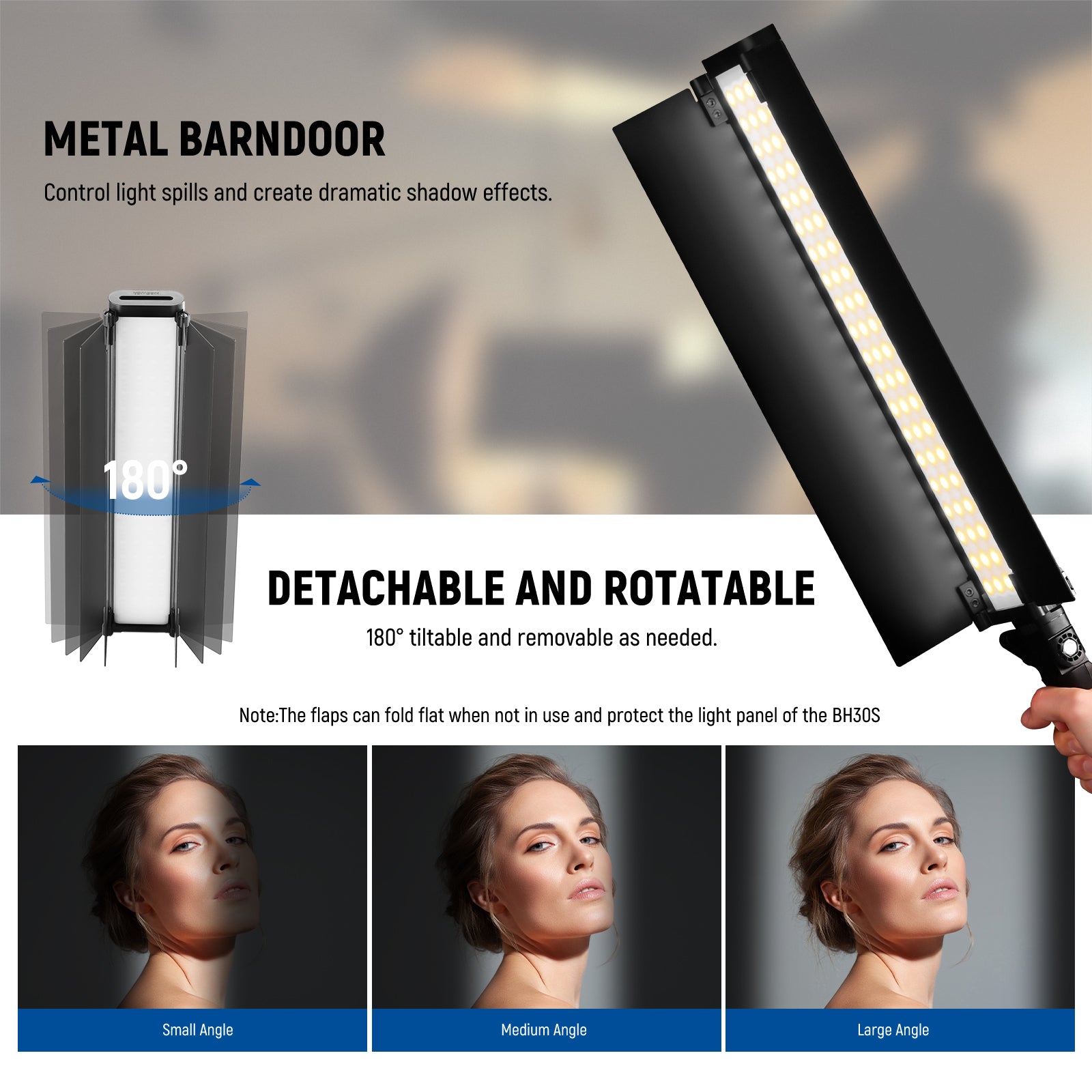 - Light Shaping Barndoors- With two hinged flaps, the barndoors let you flexibly control light spills and create dramatic shadow effects. The flaps can fold flat when not in use and protect the light panel of the BH30S