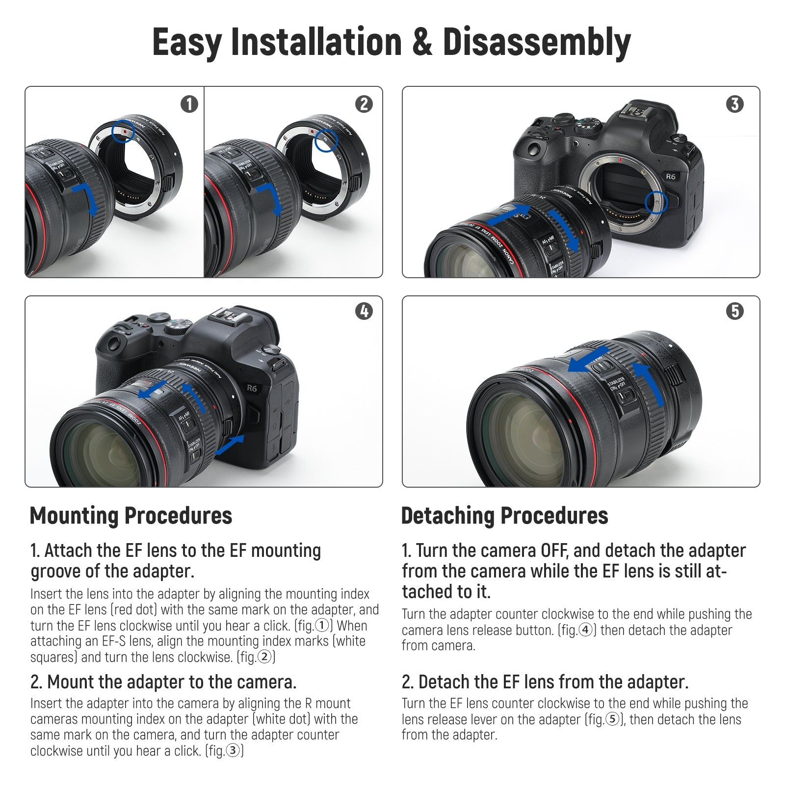 - EF Lens for RF Mount Camera- This lens adapter is compatible with Canon EF/EF-S lens to an RF mount camera, compatible with Canon EOS R Ra RP R3 R5 R5C R6 R6 Mark II R7 R8 R10, and R50