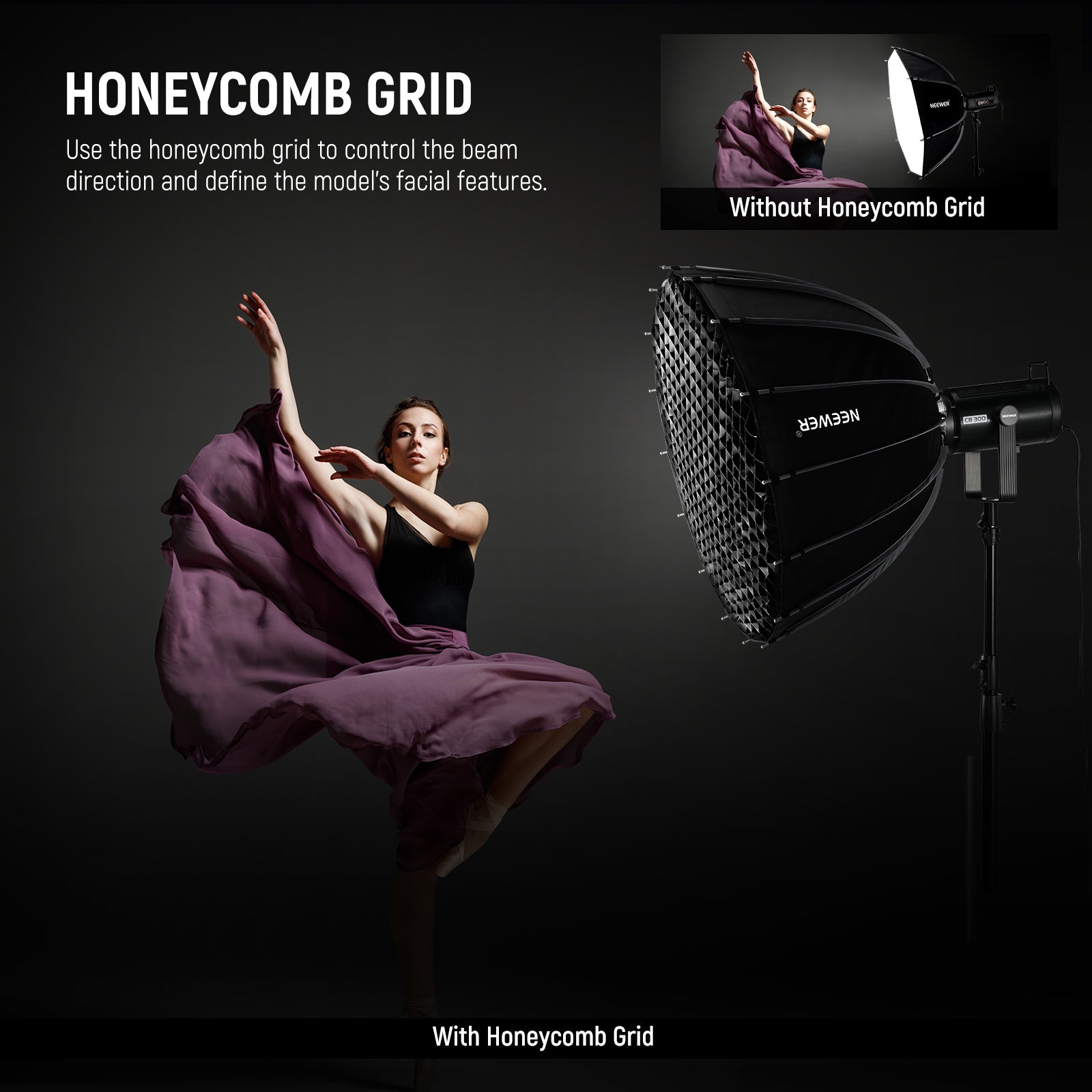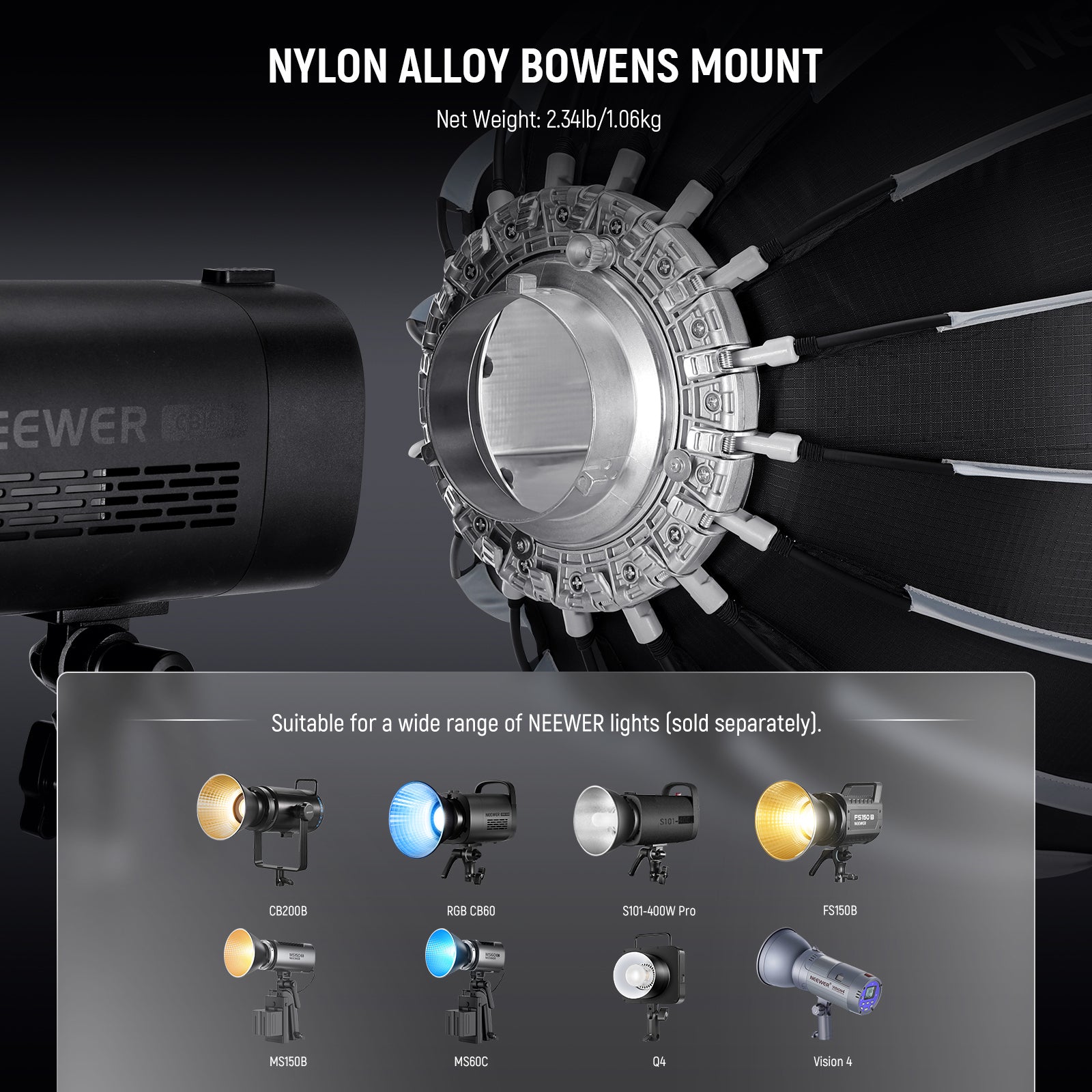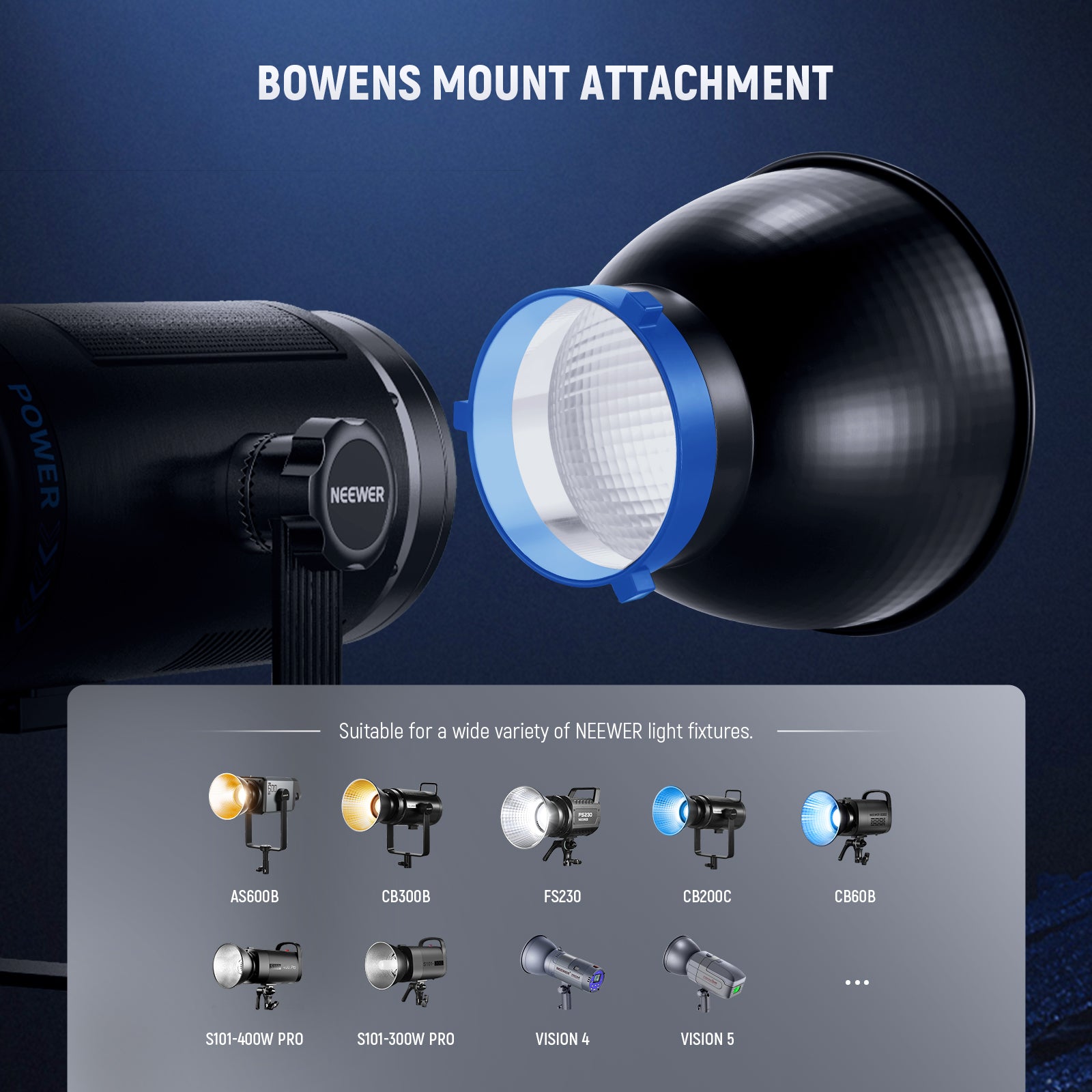 - Find More from Us- Use with NEEWER RF2 high reflective reflector (not included) to get a max illumination of 42400lux/1m. The FS150C COB continuous light can match with NEEWER FS150B, FS230B, MS60C, MC60B, MS150B, MS150C, BH30S, CB60B for group control and management