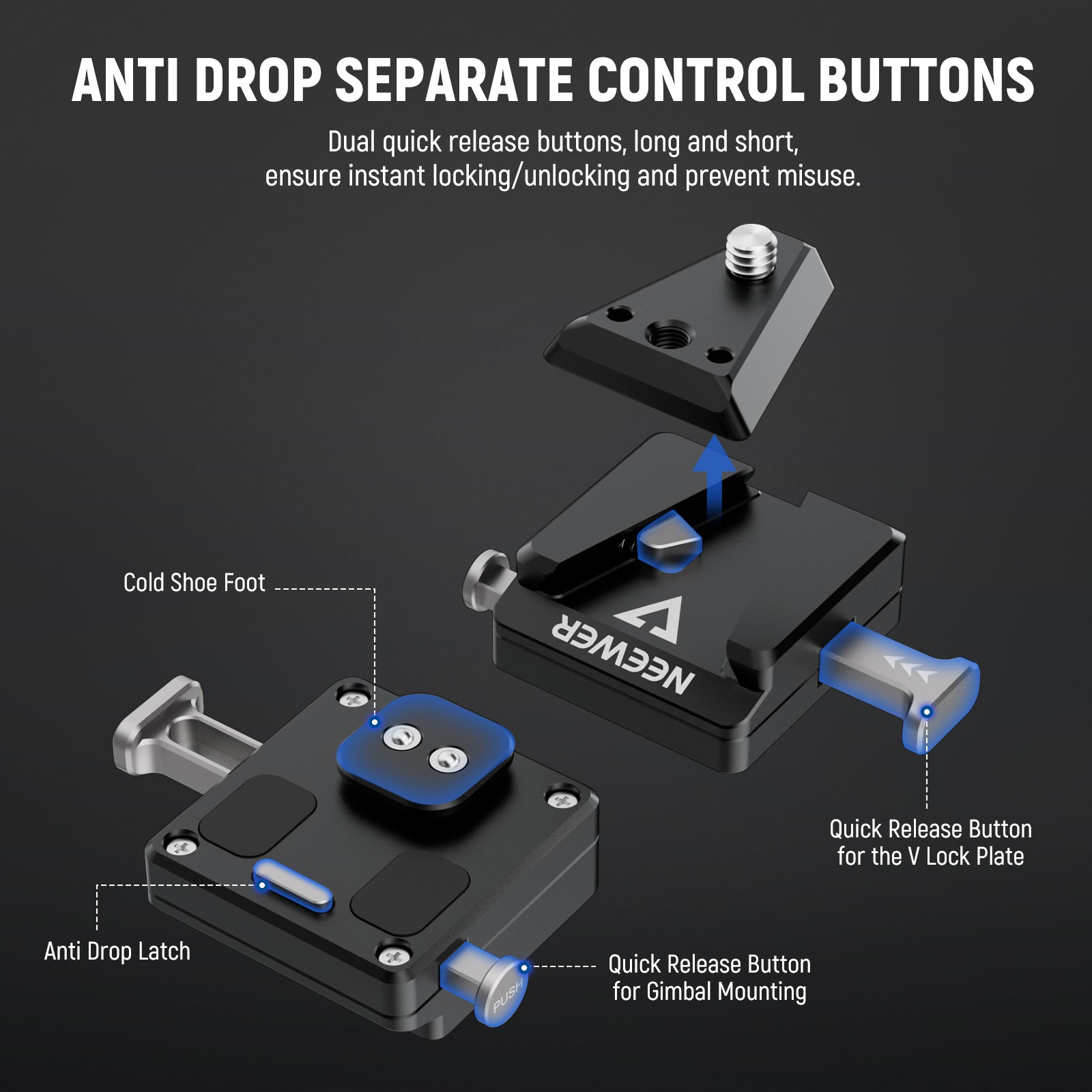 - Anti Drop Separate Control Buttons- The two independent quick release buttons: one long and one short, respectively for the V lock plate and the mount plate setup, ensure intuitive operation and prevent your battery from accidentally falling off. Instantly unlock or lock with a simple press