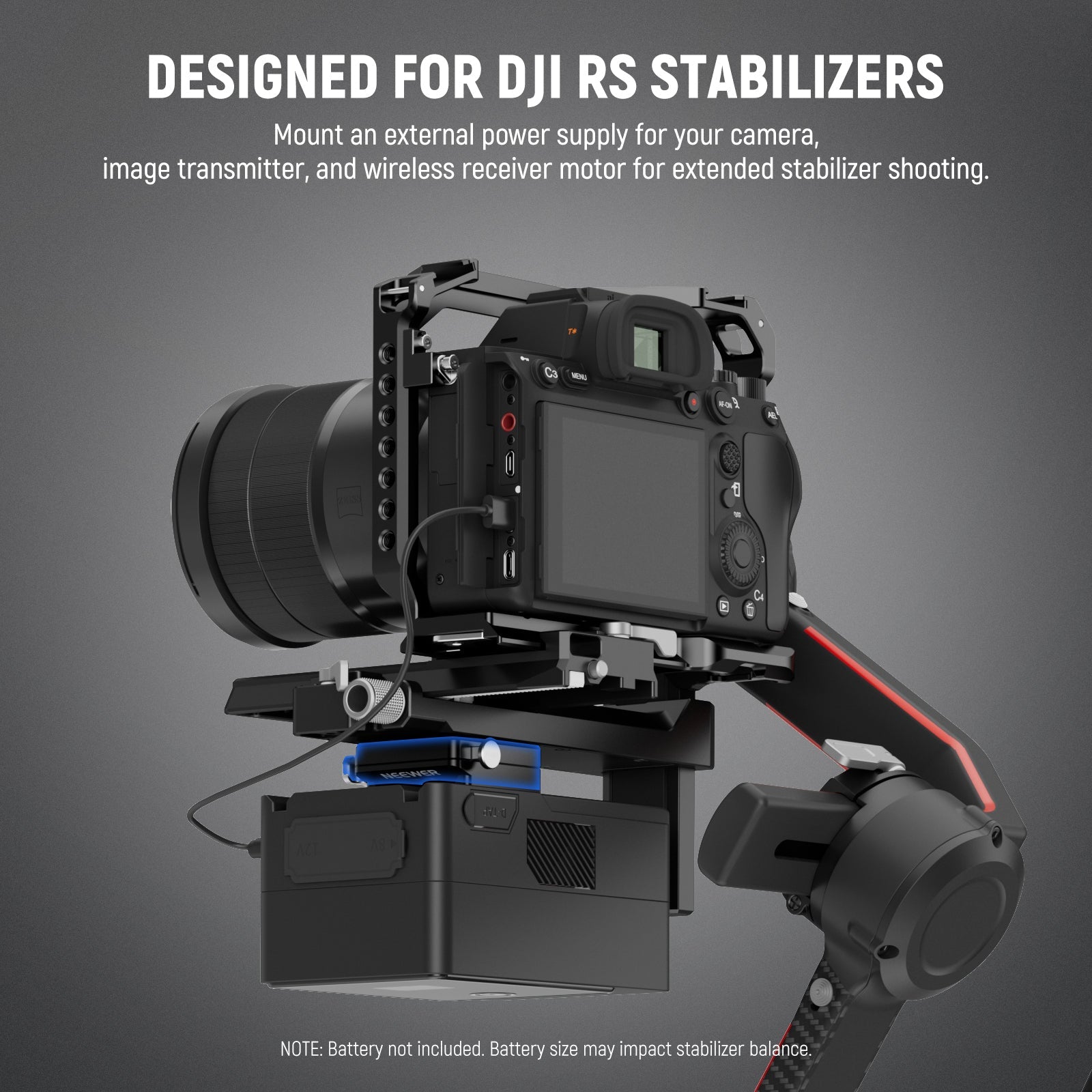 - Mini Size Power Supply Mounting Solution for Ronin RS Series- Attaches to the bottom cold shoe mount of your gimbal and allows for attaching a V mount battery or NP-F Battery with battery plate for extended power for the camera, image transmitter, wireless receiver, camera field monitor, and more devices. Compatible with DJ RS4 RS4 Pro RS3 RS3 Pro RS2 RSC2 Stabilizer. Batteries and NP-F battery plate not included