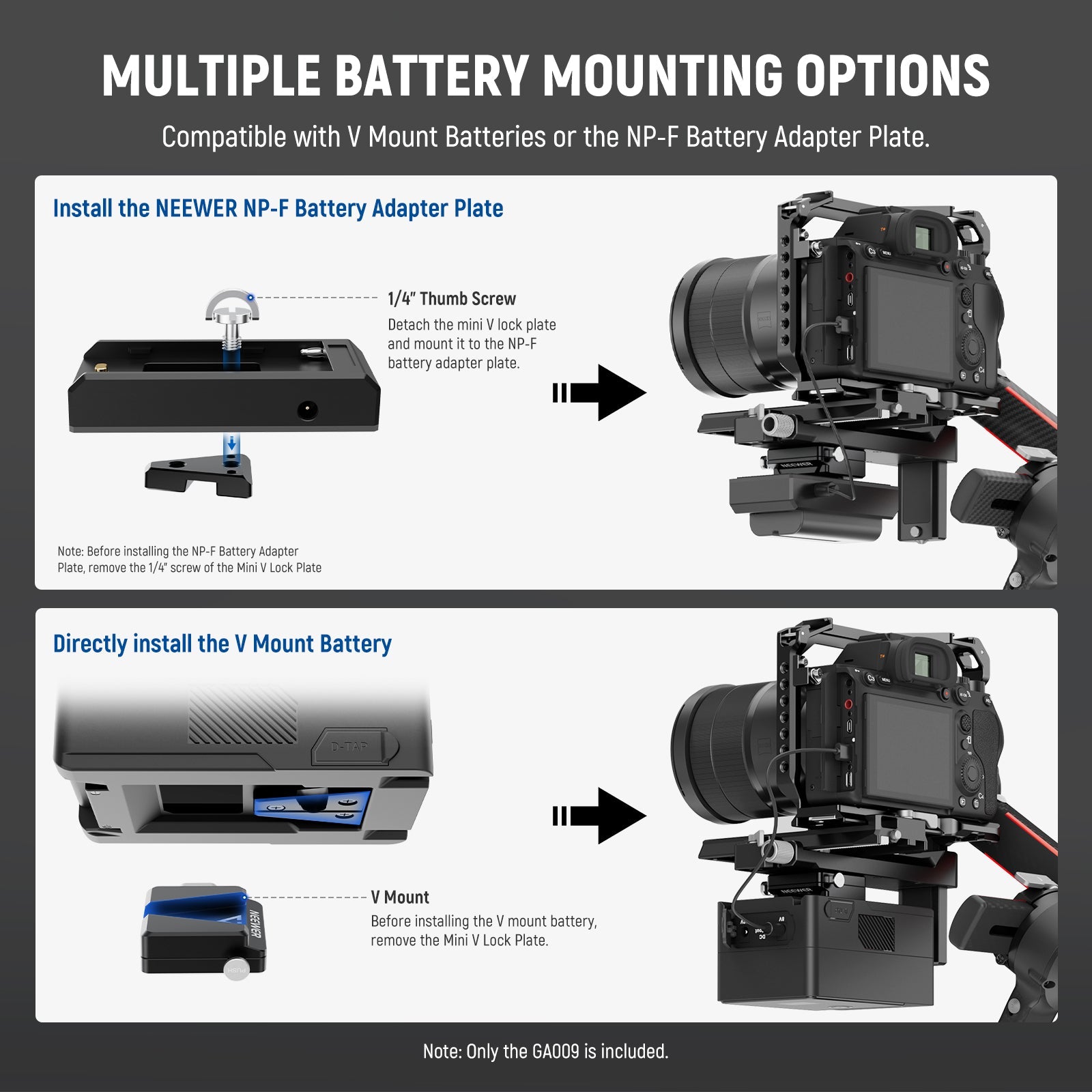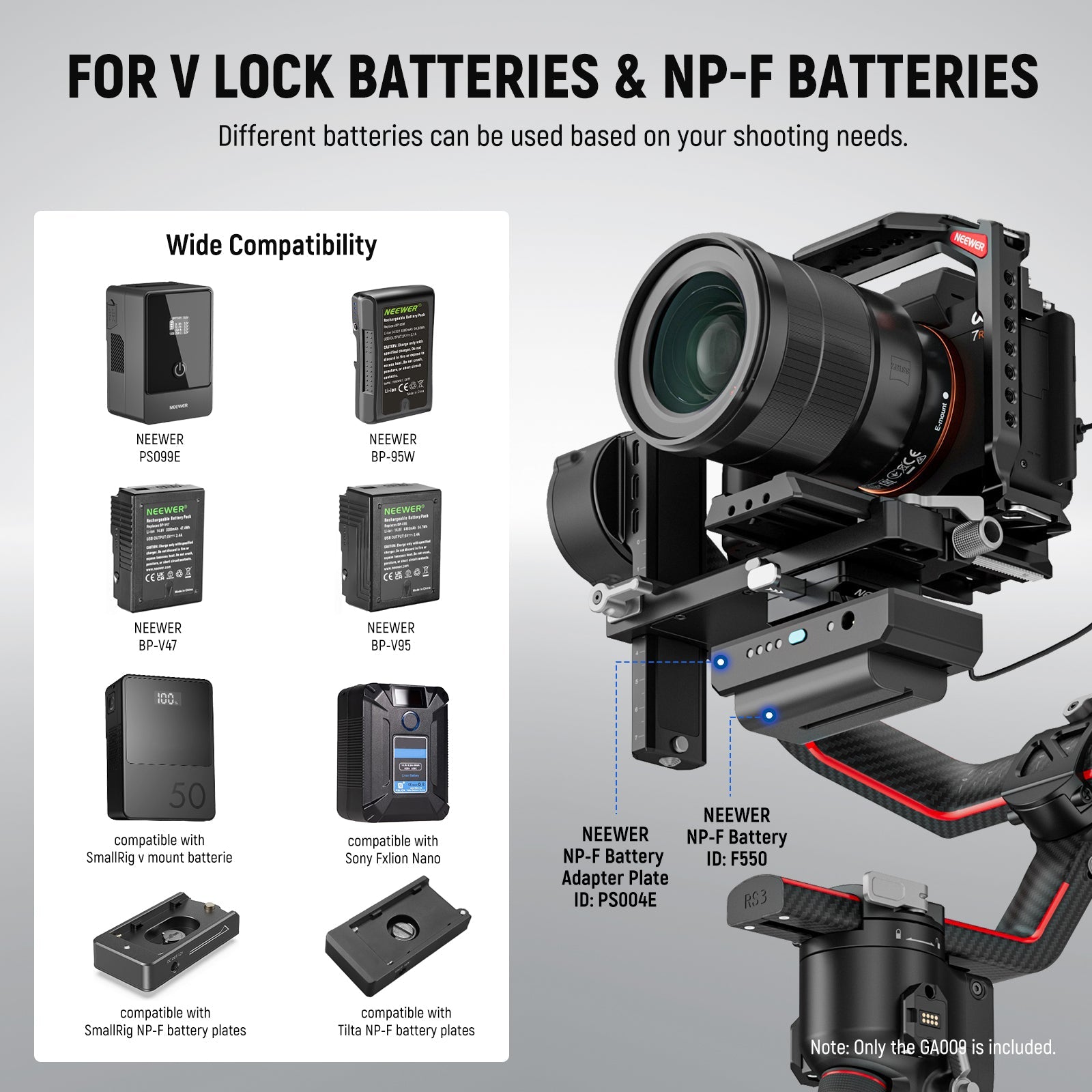 - For V Lock Batteries & NP-F Batteries- The V mount plate features a standard V lock interface, compatible with SmallRig v mount batteries, compatible with Sony Fxlion Nano NEEWER PS099E BP-V47 BP-V95 BP-95W V mount batteries. Or attach the included extra V lock plate to the NP-F battery plate using 1/4" threads, and then slide the assembled unit into the gimbal's bottom cold shoe mount, compatible with Tilta NP-F battery plates