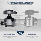 - Low Profile Ball Head Tripod Mount- To achieve steady and shake free footage, this φ40mm metal ball head lowers its gravity for increased stability, supports a load up to 22lb/10kg, and allows greater flexibility for unique angles and perspectives. The bottom 3/8" threaded hole can be attached to a tripod, monopod, slider, etc.