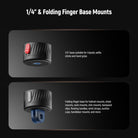 - 1/4" & Folding Finger Base Mounts- 1/4" base mount is for tripods, selfie stick poles, and handgrips. Folding finger base mount can attach to hands free helmet mounts, chest harness mounts, neck mounts, head mounts, chin strap mounts, backpack/hat clips, floating handle grips, wrist straps, suction cup holder, stroller/motorcycle/bike handlebar mounts
