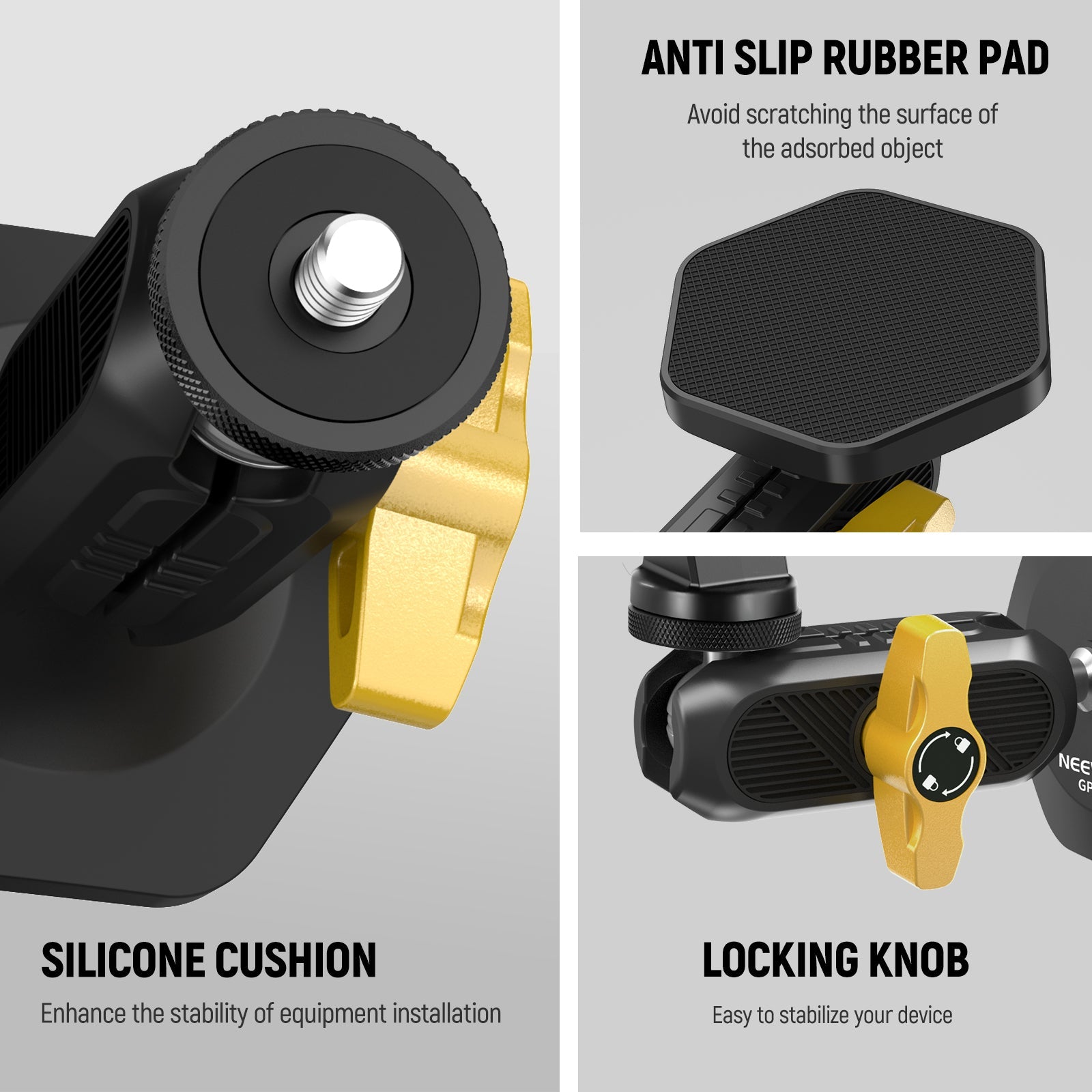 - 360° Dual Ball Head Magic Arm- The magic arm with two flexible ball heads enables 360° rotation and 180° tilt for shooting at multiple angles. Use the locking knob to quickly loosen the ball heads or fasten them into place. Note: Do not connect any extension rod. Doing so will drastically decrease the load capacity
