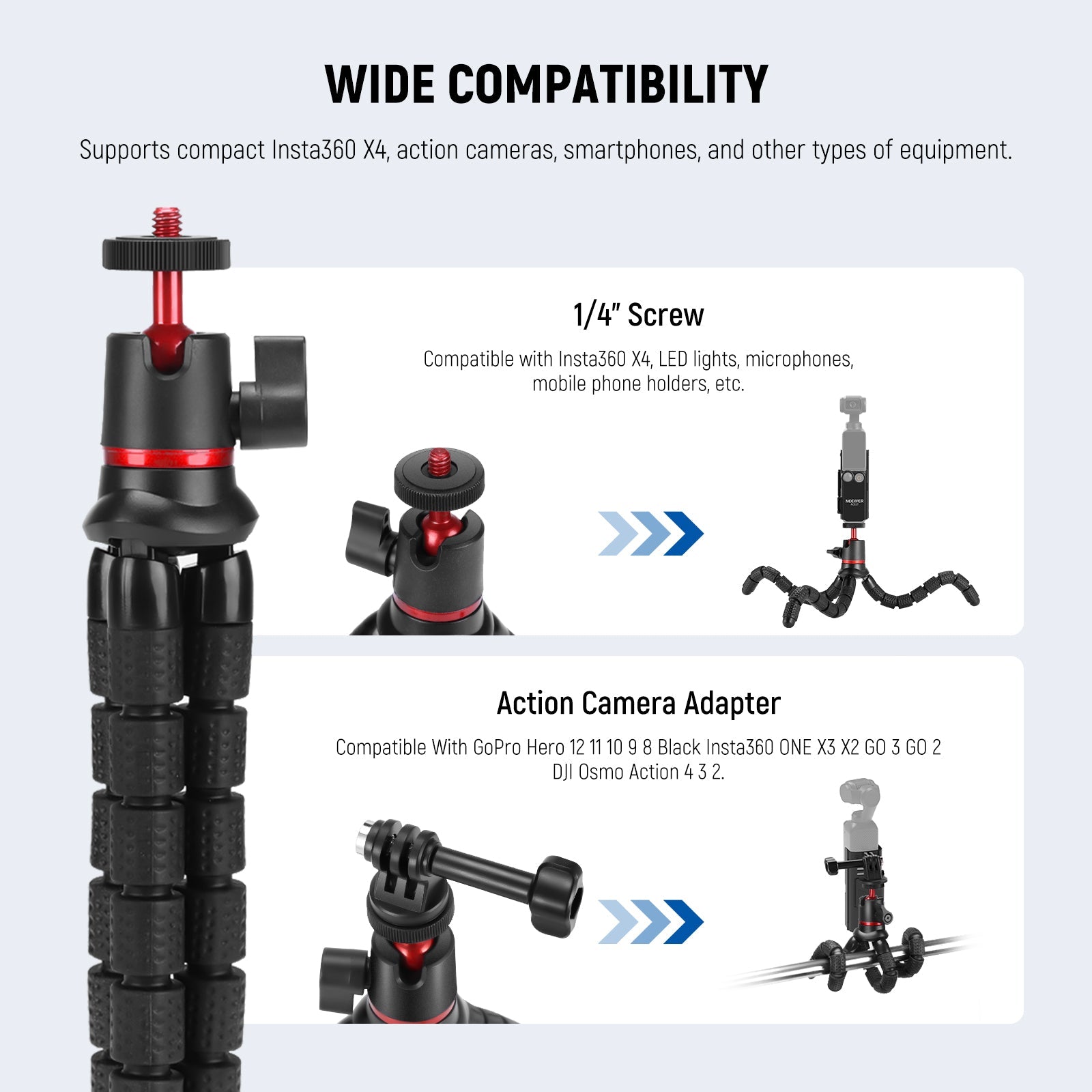 - Flexible Mini Tripod with Ball Head- The ball head offers 360° swivel adjustment, enabling effortless switching between landscape and portrait modes. Beyond handheld shooting, the tripod stand with bendable legs can securely stand on flat surfaces or wrap around poles and branches, allowing for easy video recording and photography from dynamic angles.