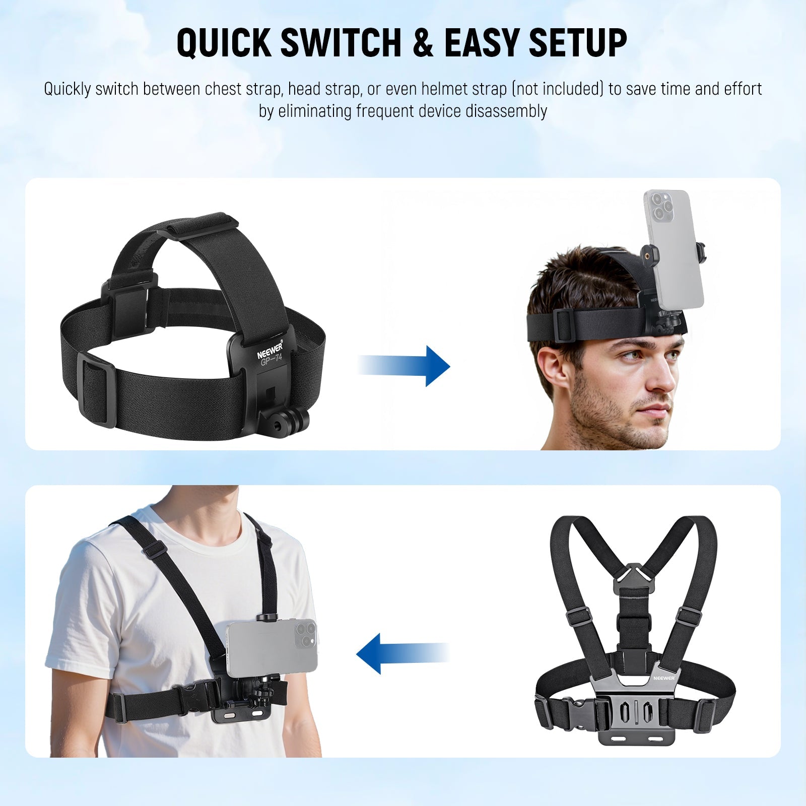 - Quick Switch & Easy Setup- Secure your phone with the base adapter and phone holder, enabling easy, quick swaps out among the chest strap, head strap, and even the helmet strap (not included) with the J hook buckle, saving time and effort by avoiding frequent device disassembly