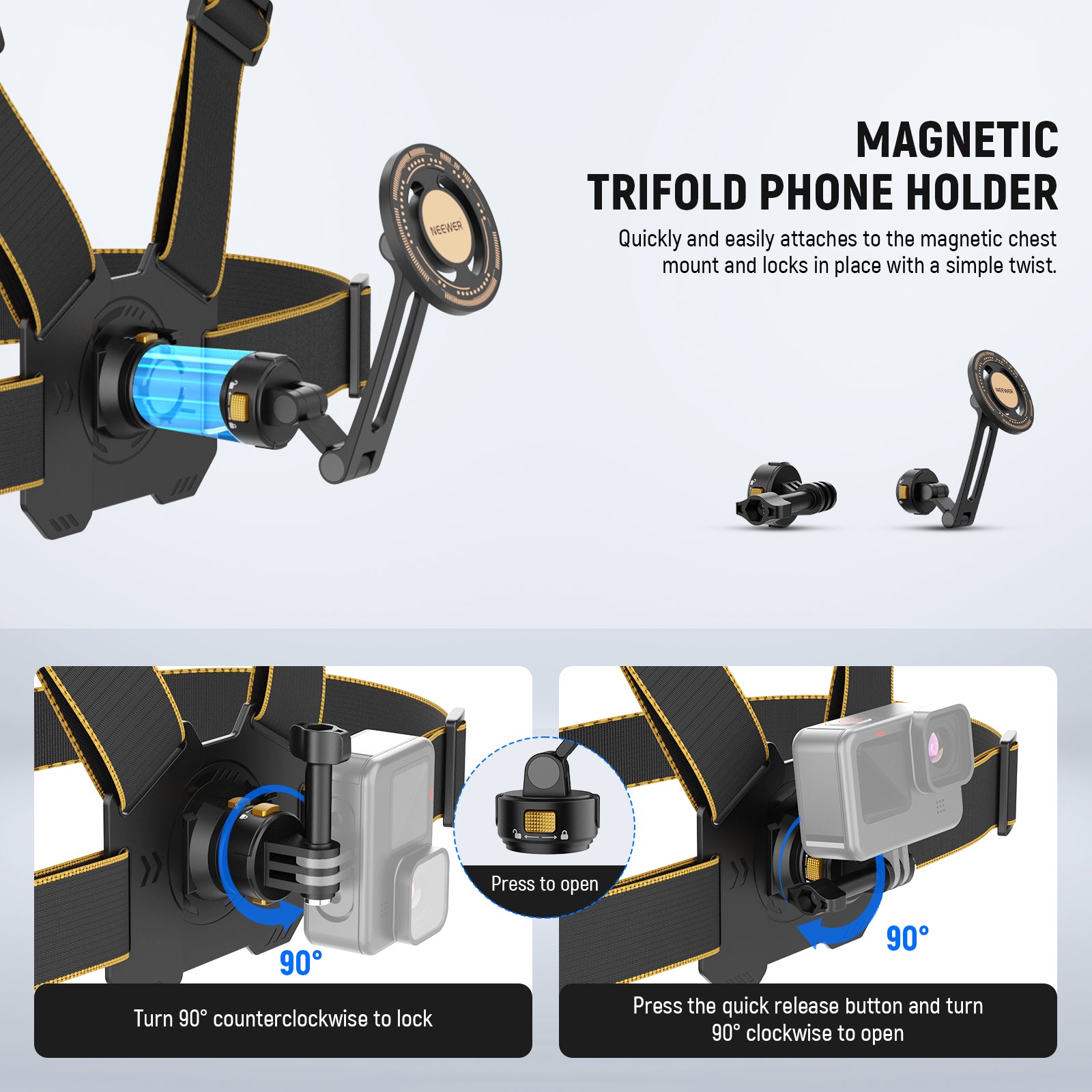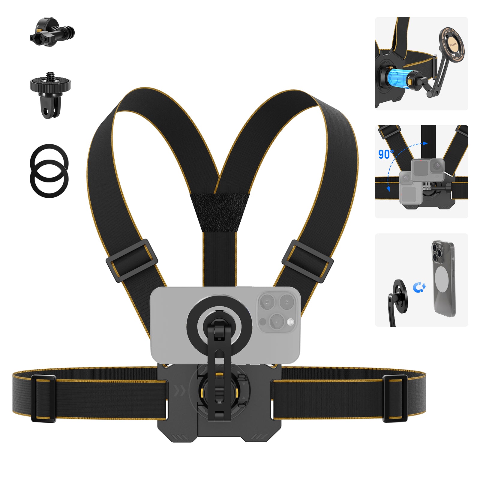 - Flexible for Various Angles- The action camera body mount adapter enables 90° rotation for switching between horizontal and vertical shooting, while the trifold magnetic chest phone holder for recording allows up to 180° adjustment to enable various angles such as overhead, upward, and vertical shooting, ideal for portrait, landscape, vlog, and other photography creations