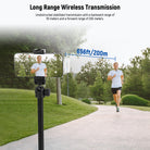 Volume Adjustment & Mode Switching- The transmitters support 5 levels of volume adjustment. Single click the function button to adjust the volume from 1 to 5 levels. Long press the function button to turn on the noise cancelling mode and short press the power button to open the mute mode. Easy to use, one click to start. The mini body microphones mics support up to 656ft/200m barrier free forward stable transmission, and 20m/65ft back transmission