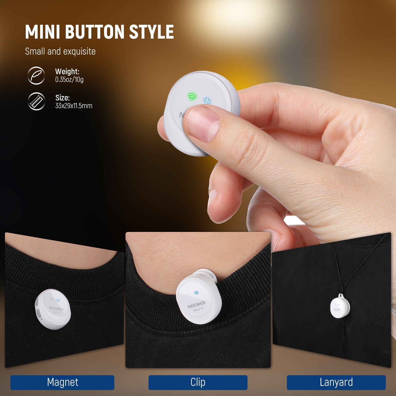 - Button Sized Clip on Microphone- Featuring a tiny button shaped design, each transmitter weighs only 0.35oz/10g. With 48kHz/24bit audio format, the portable wireless microphone system captures every sound with optimal accuracy. The lav mic ensures stable audio signals with minimal background noise at more than 70dB signal to noise ratio, capable of recording in a high pitched environment with a maximum 120dB sound pressure level. Support one click mute
