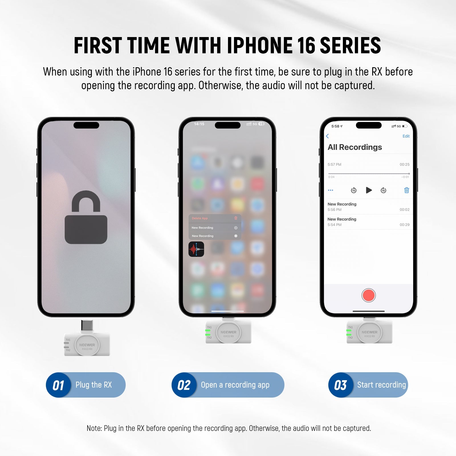 - Plug & Play, Wide Compatibility- Plug the RX into your equipment, and the TX and RX will automatically pair with each other without Bluetooth or APP connection. The receiver of this tiny external cordless microphone mic accessories set is compatible with iPhone 16 15 Pro Max Plus iPad series Samsung Galaxy S23 S24 Ultra, and other Android cell phone, PC, computer, or laptop with USB C interface. Note: For some USB C phones, need to enable the OTG function in the phone settings