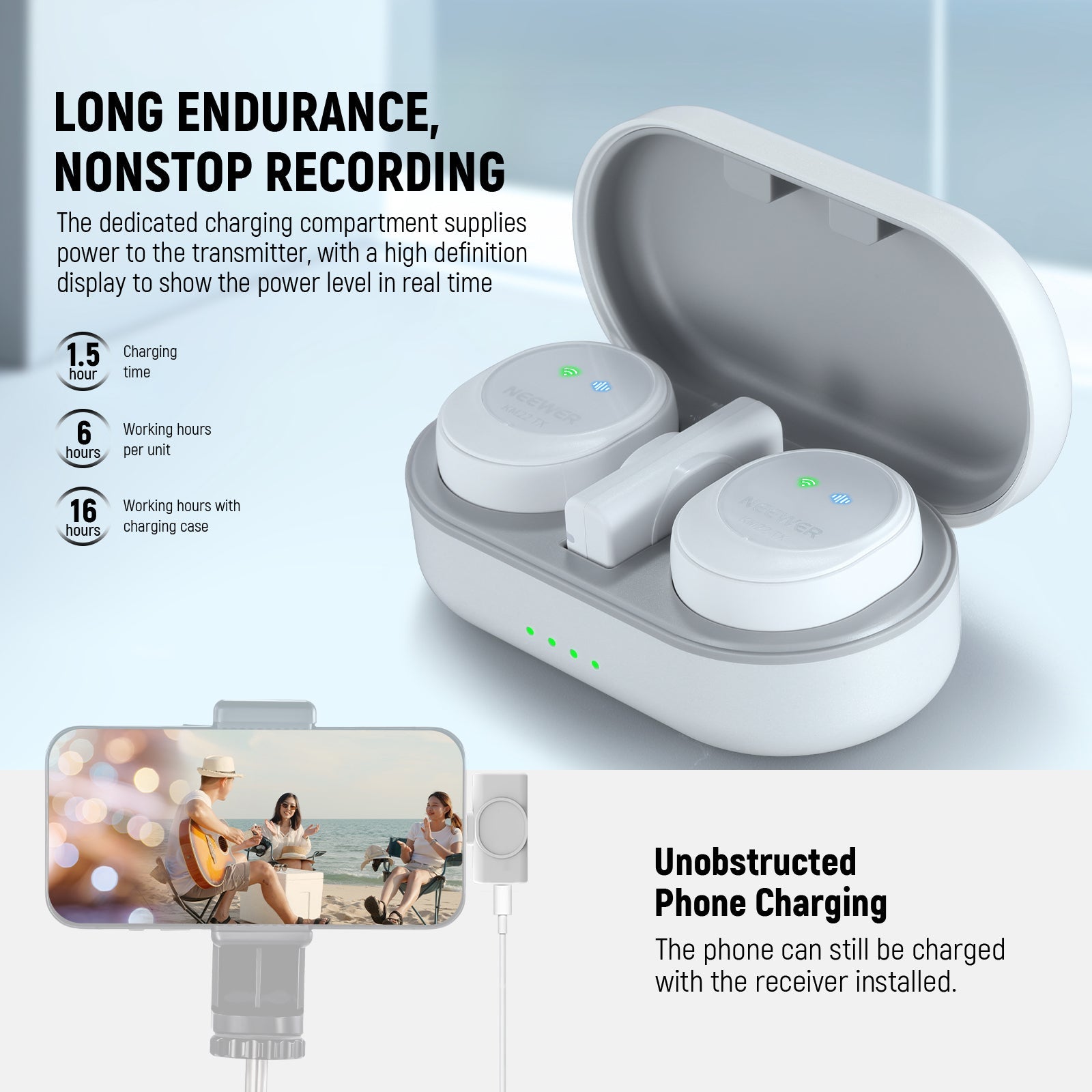 - Impressive Running Time- Each transmitter can work for about 6 hours, and the charging case supports charging 2 transmitters 1.5 times simultaneously. Or enjoy unobstructed access to charge your phone via the charging port of the receiver without disturbing the recording