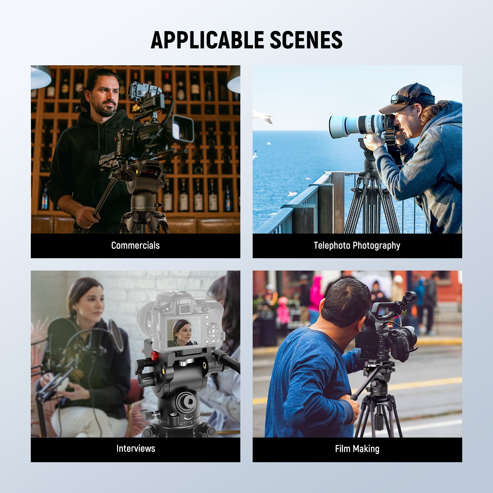 - Damping Adjustable Pan/Tilt Fluid Head- The video tripod with fluid head and a removable telescopic handle enables effortless 360° pan and +90°/-70° tilt adjustments, with separate mechanisms to control friction, ensuring smooth and precise movement for different camera weights. The ?74mm detachable bowl head adapter and locking handle allow for rapid leveling on uneven terrain. The built in bubble level helps check the stability after each adjustment