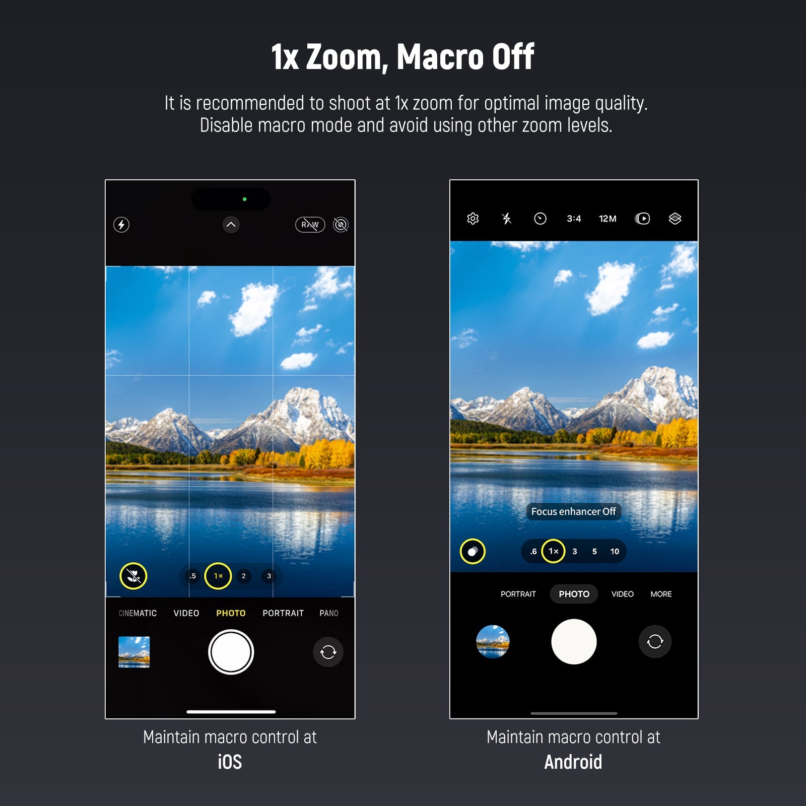 - Note- Before use, please clean the main camera and additional cameras of your phone. Vignetting may occur depending on phone models. In this case, please tighten the lens or zoom the camera magnification to 1.1x