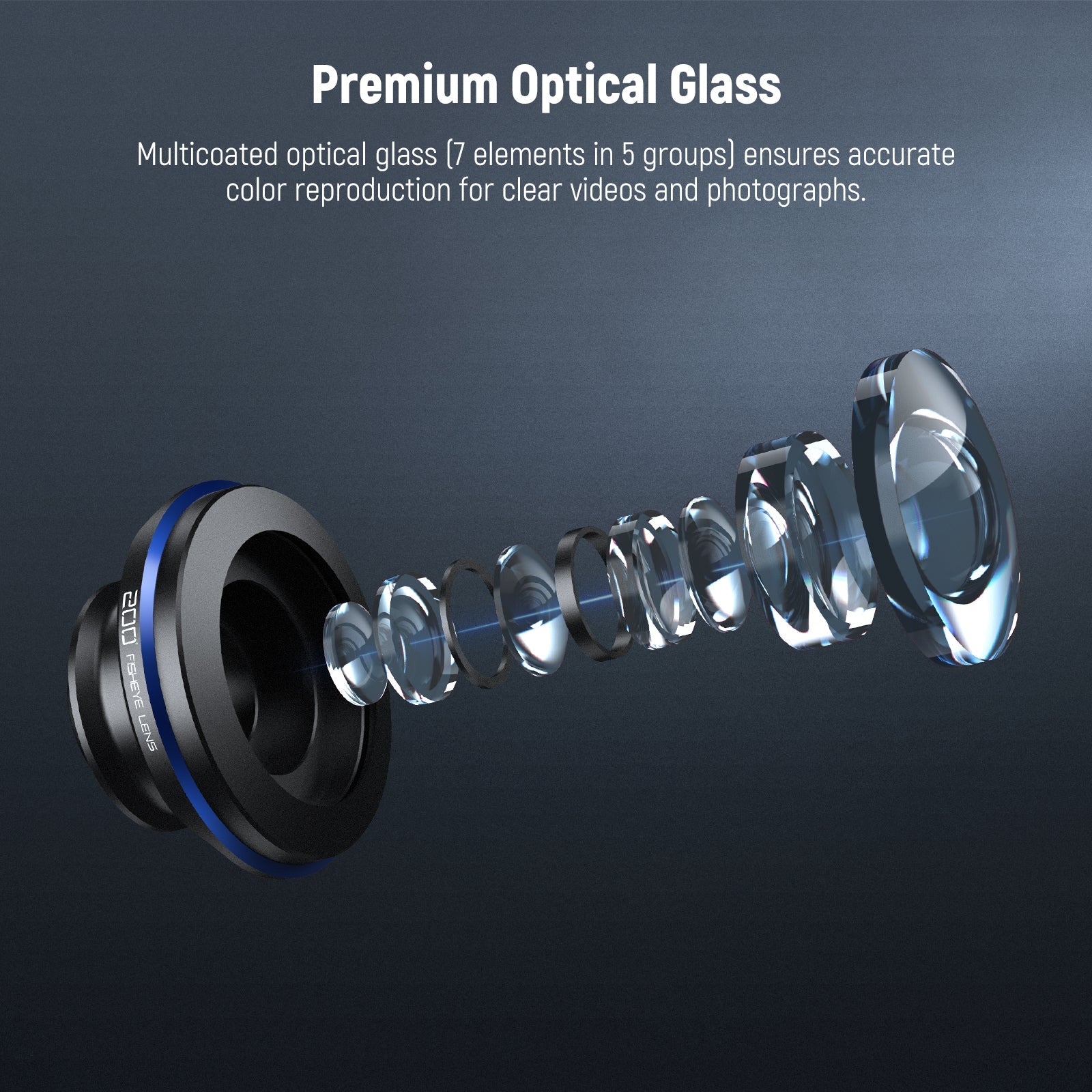 - 200° Fish Eye VR Lens- The 200° fish eye lens views the world through the eyes of a fish, with a sharp center and darkened edges, it fills the frame with a visually striking effect, enhancing every detail with dramatic impact